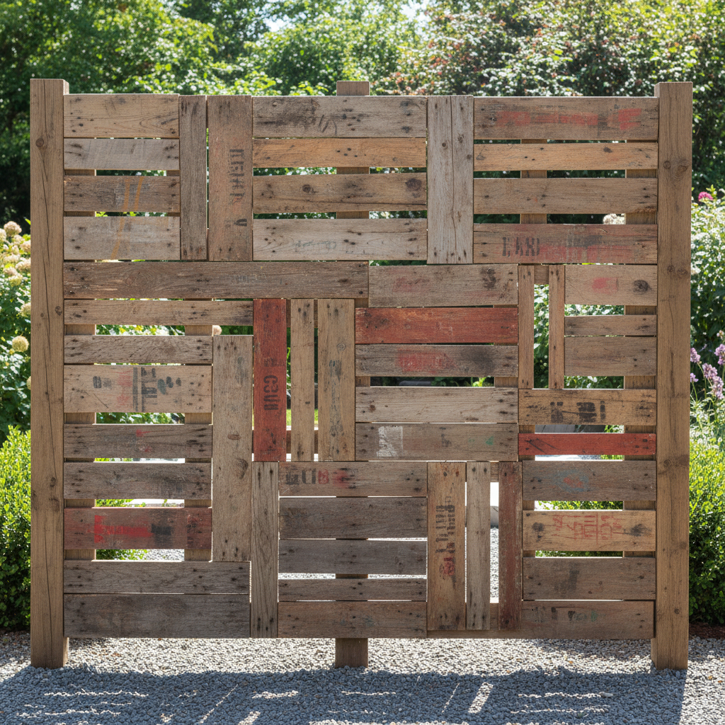 For an eco-friendly and budget-conscious option, reclaimed wood pallets can be transformed into unique privacy screens. Their distressed texture and varied wood tones create a rustic, industrial-chic look. The mood is informal and creative, perfect for a relaxed, bohemian, or urban garden setting.