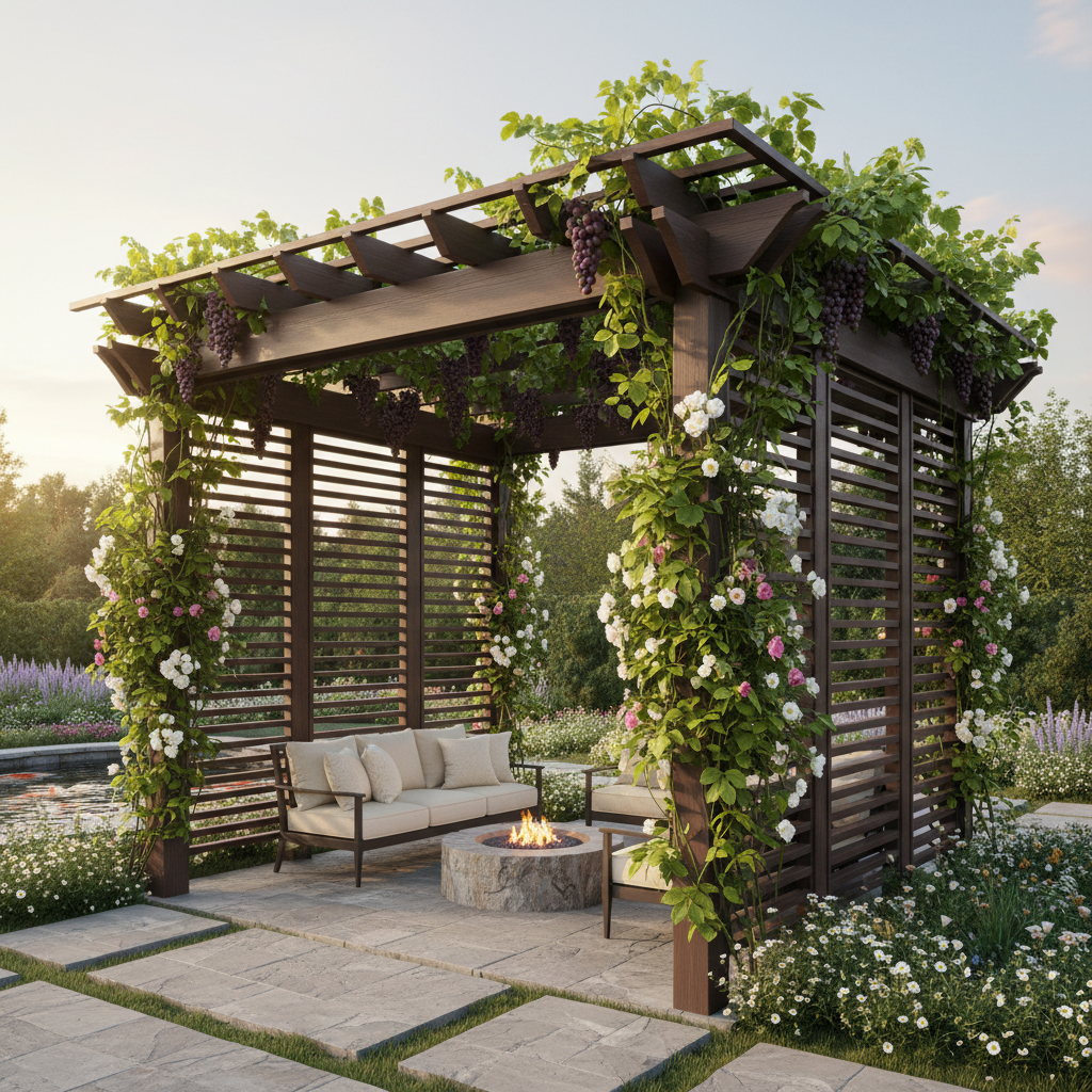 A pergola offers a semi-private overhead structure, but adding side screens—whether slatted wood, lattice, or outdoor curtains—enhances its seclusion. This creates a cozy outdoor room. The mood is architectural and inviting, often with a mix of wood and fabric textures.