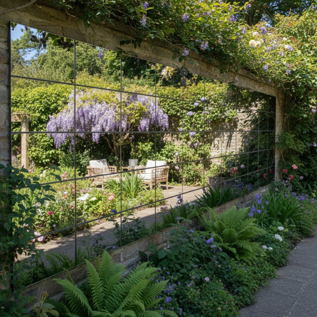 Strategically placed outdoor mirrors can create an illusion of space while reflecting desirable views and camouflaging less appealing ones. When angled correctly, they can provide privacy by reflecting only sky or foliage. The mood is artful and expansive, adding unexpected depth to your garden.