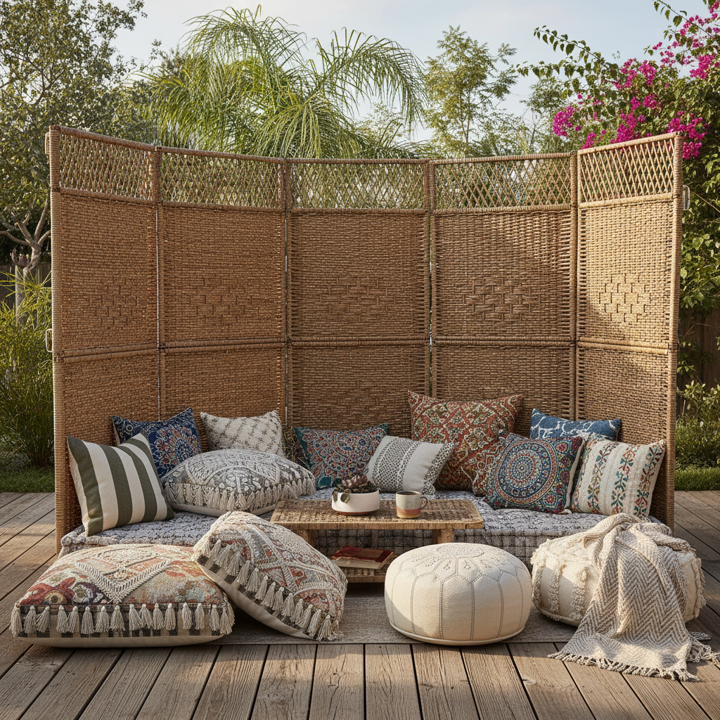 Natural wicker or rattan panels bring a bohemian or coastal vibe to your backyard. Their intricate weaving patterns add texture and warmth. The mood is relaxed and inviting, pairing beautifully with natural wood furniture, soft linen cushions, and a palette of sand tones, whites, and blues.