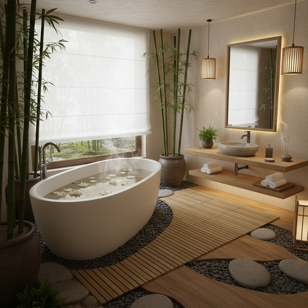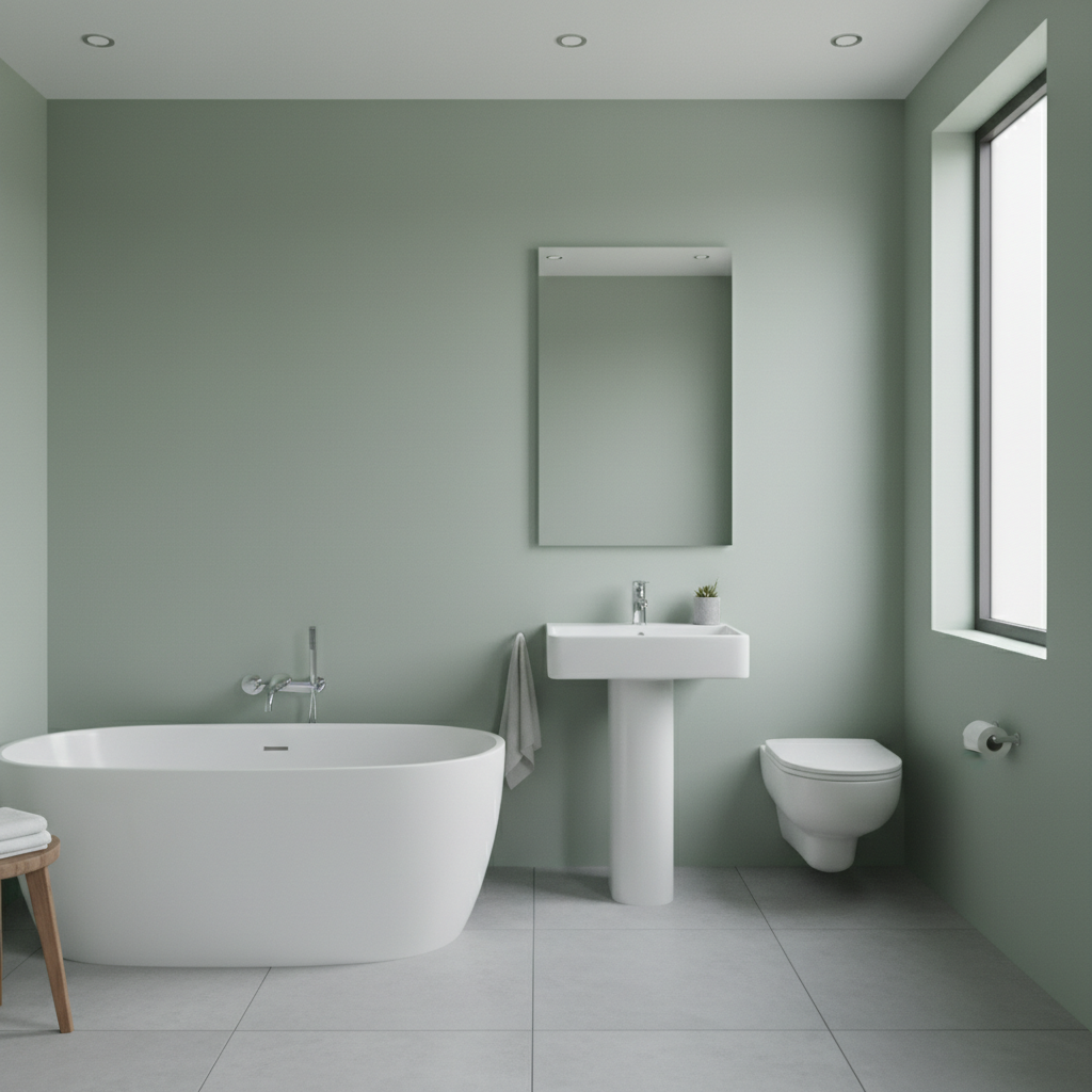 Transform your bathroom into a true spa sanctuary using tranquil sage green. Soft sage walls create an immediate sense of calm. Incorporate natural wood elements like bamboo or light oak for a vanity and shelving. Smooth river stones or pebble tiles in the shower floor add a tactile, earthy touch. The color palette focuses on sage, white, and natural wood tones, with subtle grey or stone accents. Materials include polished stone, smooth ceramics, and crisp white linens. Lighting is soft and diffused. The mood is deeply peaceful, restorative, and minimalist, encouraging relaxation and mindfulness.