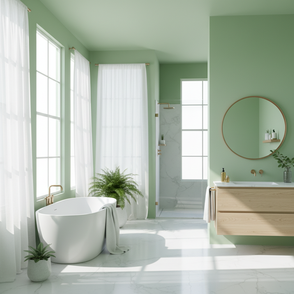 Maximize natural light with a bright and airy sage green design. Use a very pale, almost pastel sage on the walls, allowing it to reflect light. Pair with light-colored flooring, such as white large-format tiles or light wood-look planks. A simple white vanity with clean lines and polished chrome fixtures keeps the space feeling open. The color palette is light and fresh: pale sage, white, cream, and clear glass. Materials are reflective and smooth: glossy tiles, polished chrome, and clear glass shower enclosures. The mood is uplifting, expansive, and incredibly refreshing.