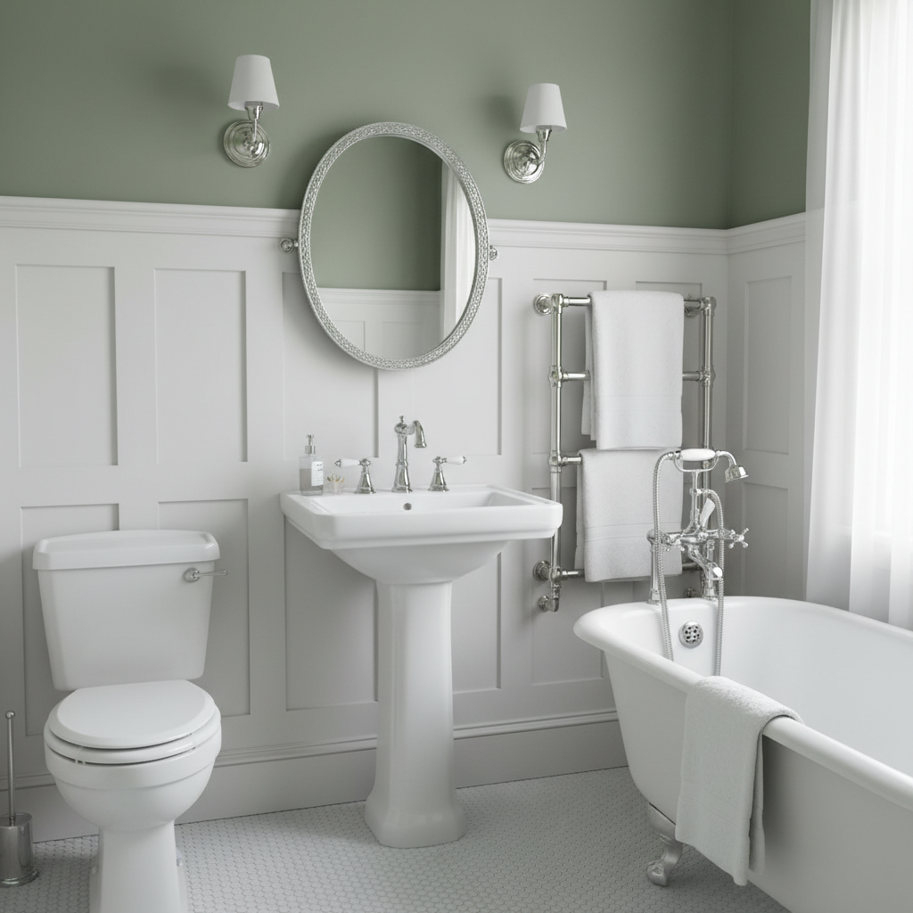 For a timeless and elegant look, embrace traditional sage green. Walls with classic wainscoting painted in a gentle sage, topped with a soft cream or white, create a refined backdrop. A classic white ceramic pedestal sink or a dark wood vanity with intricate details fits perfectly. Polished chrome or brushed nickel fixtures offer a sophisticated shine. The color palette is understated: sage, cream, white, and dark wood. Materials include ceramic tiles, marble countertops, and quality textiles. Furniture shapes are classic and sturdy. The mood is one of enduring grace and quiet sophistication.