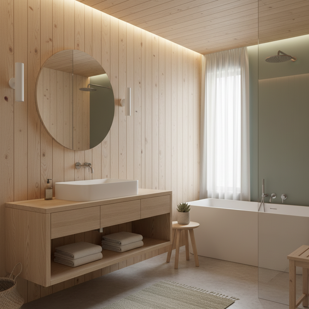 Embrace the clean lines and natural warmth of Scandinavian design with sage green. Light sage walls create a serene, airy feel. A light birch or ash wood vanity with simple, clean lines is central. The color palette is minimalist: sage, white, light wood, and grey accents. Materials are natural and functional: light wood, matte white tiles, and simple, functional fixtures in brushed chrome or black. Furniture silhouettes are uncluttered and highly functional. The atmosphere is bright, calm, and effortlessly stylish, emphasizing comfort and hygge.