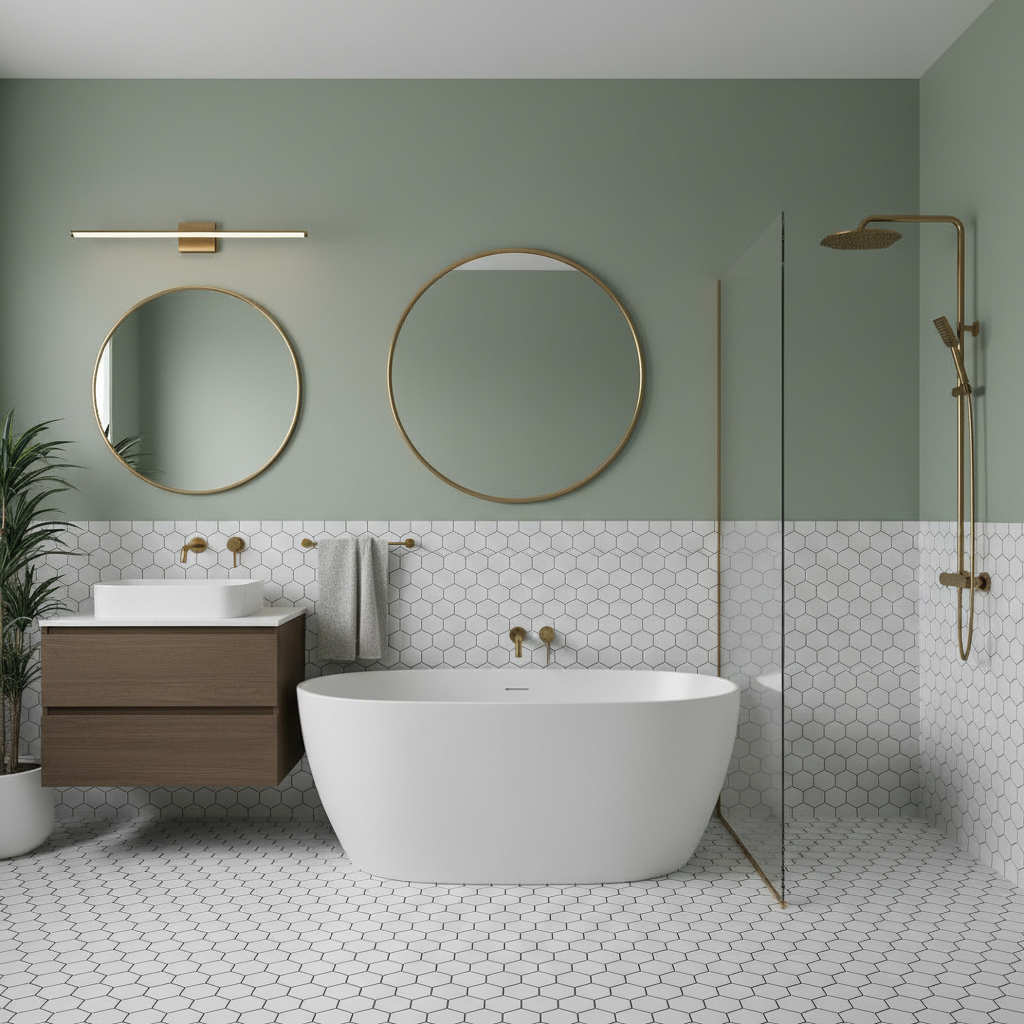 Introduce visual interest with geometric sage patterns. This could be a floor laid with sage and white patterned tiles, or a shower enclosure featuring sage green geometric mosaic tiles. Walls might be a solid, complementary sage, allowing the patterns to shine. A sleek, modern vanity with a simple profile and matte black fixtures works well. The color palette is focused: sage, white, black, and perhaps a touch of warm grey. Materials include ceramic or porcelain tiles, smooth countertops, and minimalist metals. The mood is contemporary, dynamic, and visually engaging.