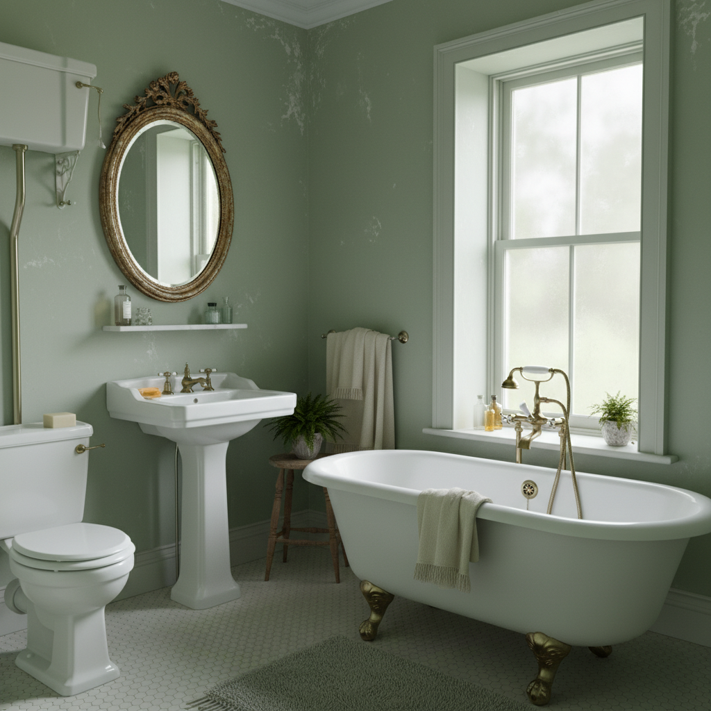 Step back in time with a vintage-inspired sage green bathroom. Soft, muted sage green walls provide a charming backdrop for a classic clawfoot tub in white or a complementary pale color. A traditional console sink with polished chrome legs and a vintage-style mirror with an ornate frame complete the look. The color palette is nostalgic: sage, cream, white, and brushed nickel or chrome. Materials include subway tiles, mosaic floor tiles, and classic porcelain fixtures. Furniture shapes are elegant and historical. The mood is charming, romantic, and full of character.
