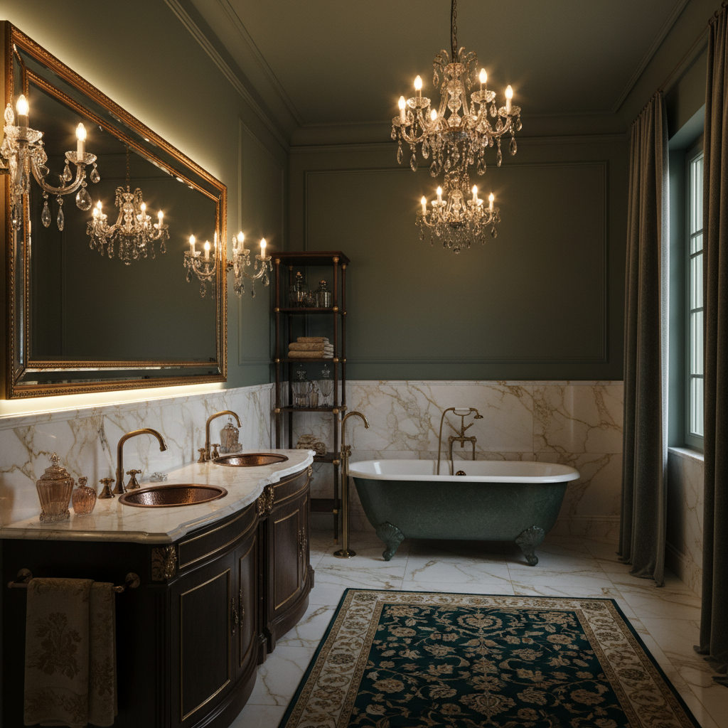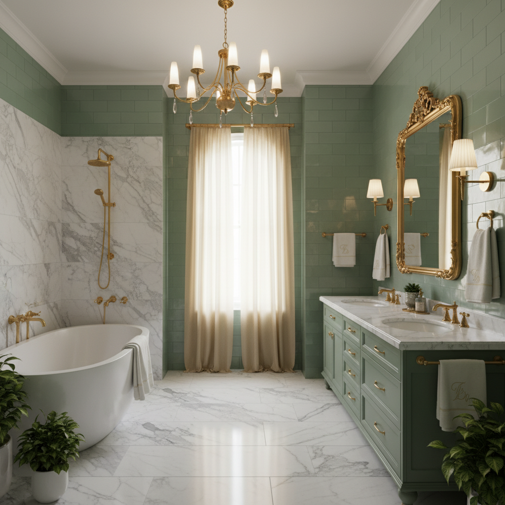 Elevate your bathroom with the luxurious pairing of sage green and gold. A rich, deep sage green on walls or cabinetry creates a jewel-box effect. Introduce opulent gold fixtures—a stunning faucet, a showerhead, and cabinet pulls—to add sparkle. Marble countertops and large format white or black tiles enhance the sophisticated feel. The color palette is lavish: deep sage, gold, white, and black. Materials are high-end: marble, polished gold, glossy tiles, and perhaps a touch of velvet. Furniture silhouettes are elegant and refined. The mood is undeniably glamorous and indulgent.