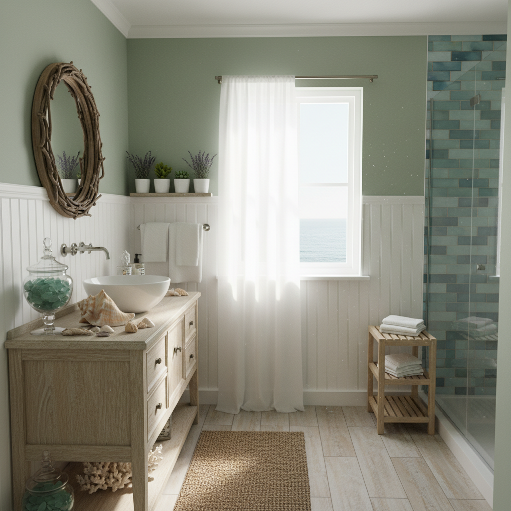 Bring the serenity of the seaside indoors with a coastal sage green bathroom. Light, airy sage walls pair beautifully with bleached driftwood-style vanities and white shiplap accents. The color palette includes soft blues, sandy beiges, and crisp whites. Materials are natural and light: white subway tiles, light wood, woven sisal rugs, and polished chrome or brushed nickel fixtures. Round porthole-style mirrors or shell-adorned decor can enhance the theme. The atmosphere is refreshing, breezy, and effortlessly tranquil, like a gentle ocean whisper.