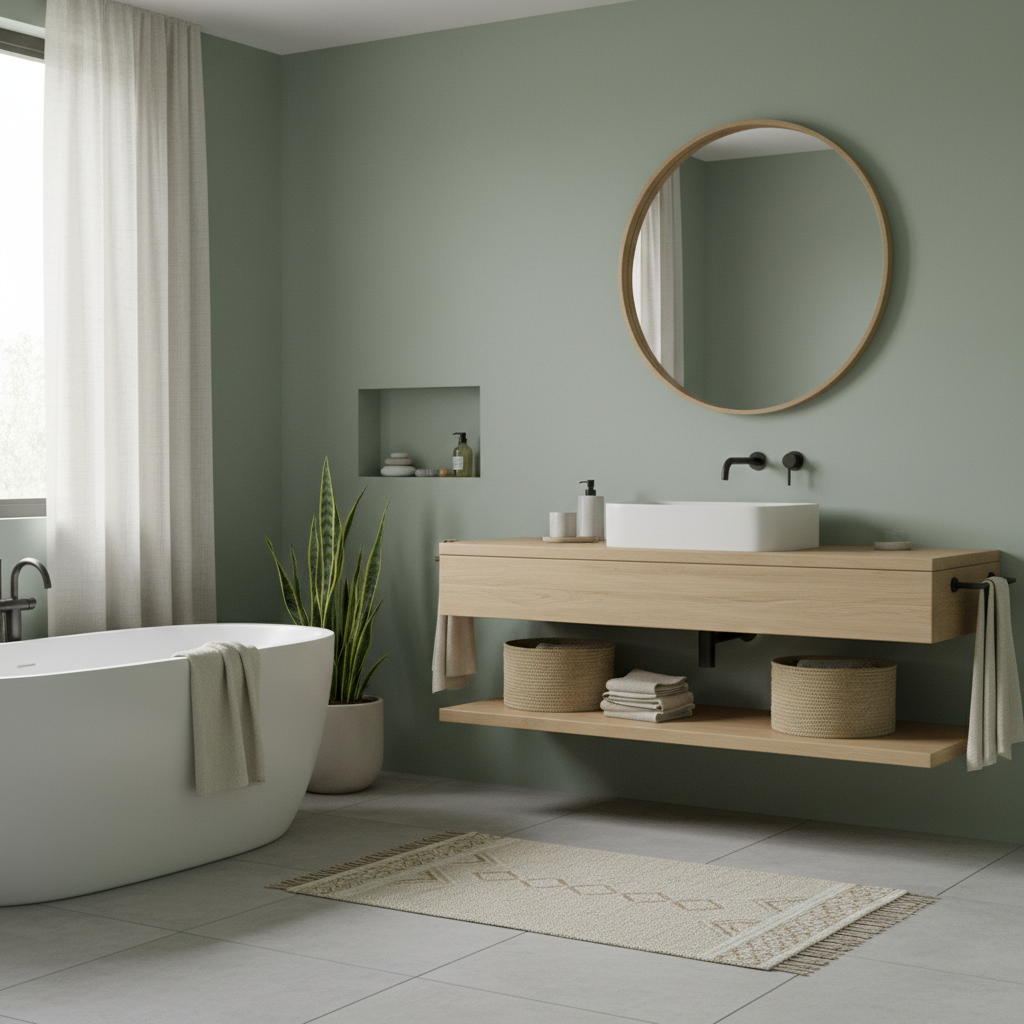 Combine Japanese minimalism with Scandinavian functionality in a Japandi sage green bathroom. Very light, muted sage walls create a serene and uncluttered space. A simple, low-profile vanity in light oak or ash, paired with a minimalist white ceramic sink, embodies this aesthetic. The color palette is restrained: pale sage, white, light wood, and soft grey. Materials are natural and honest: light wood, smooth concrete, ceramic tiles, and linen textiles. Furniture silhouettes are clean-lined, functional, and close to the ground. The mood is tranquil, balanced, and deeply harmonious.