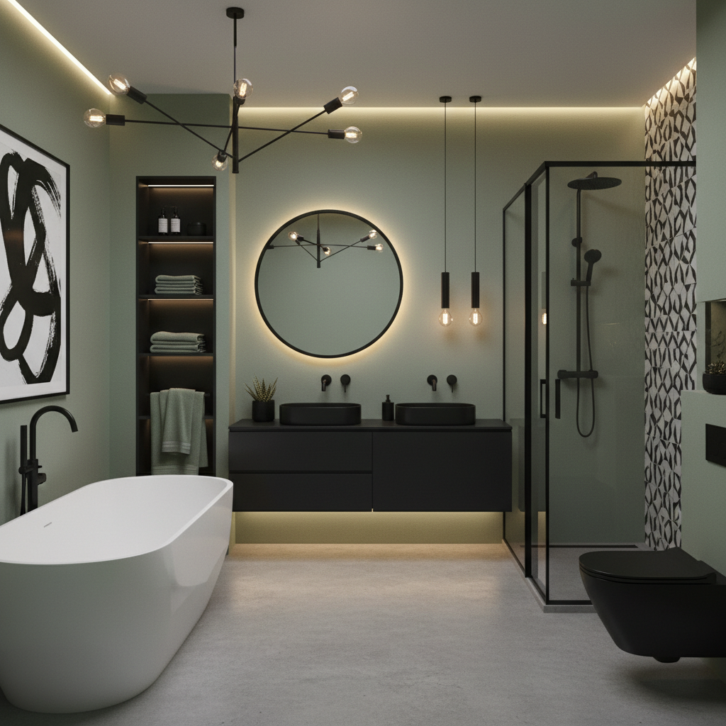 Achieve urban chic sophistication by blending sage green with sleek, modern elements. A feature wall in a medium sage green is complemented by crisp white or light grey walls. A floating vanity in a dark wood or black finish, paired with a large, round black-framed mirror, enhances the urban vibe. The color palette is refined: sage, black, white, and deep grey. Materials include polished concrete, large-format tiles, black metal, and sleek glass. Furniture silhouettes are sharp, minimalist, and highly functional. The mood is polished, contemporary, and effortlessly stylish.