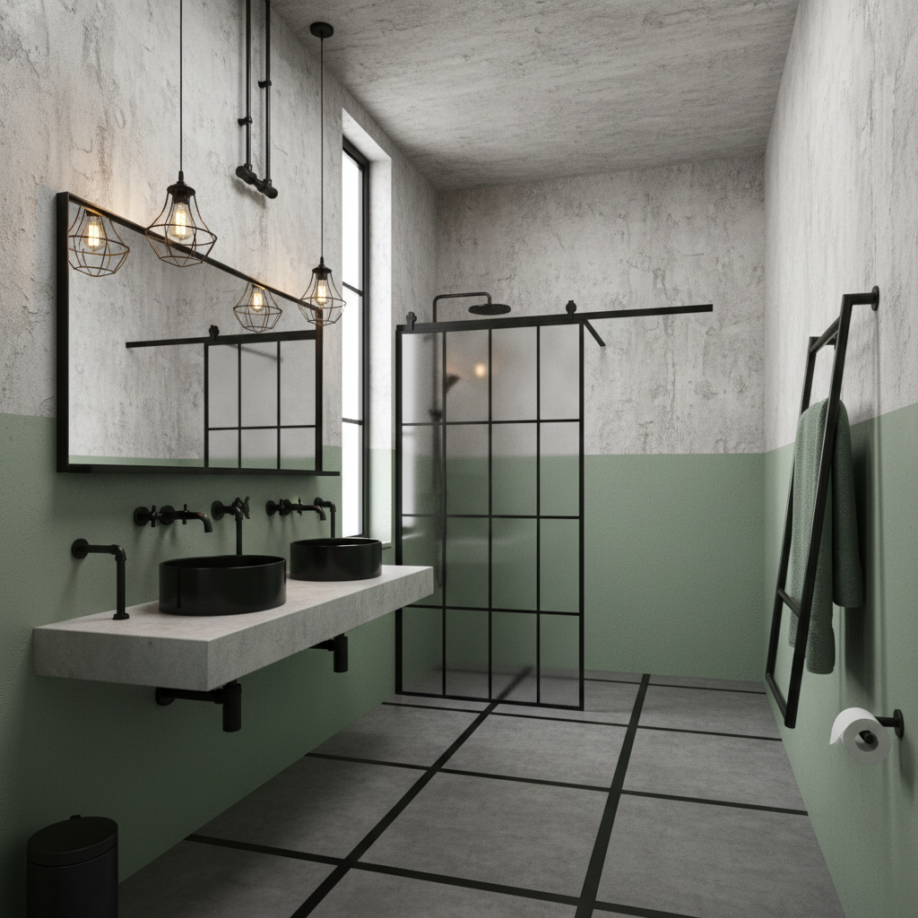For a bold and contemporary look, combine sage green with industrial elements. Think polished concrete floors or walls, complemented by a feature wall painted in a muted sage. Black metal-framed shower enclosures, exposed piping, and a sleek, minimalist vanity with a concrete countertop define this style. Materials include concrete, black steel, matte black fixtures, and perhaps a touch of warm wood to soften the edges. Furniture silhouettes are sharp and geometric. The mood is sophisticated, urban, and effortlessly cool, blending raw textures with a touch of natural calm.
