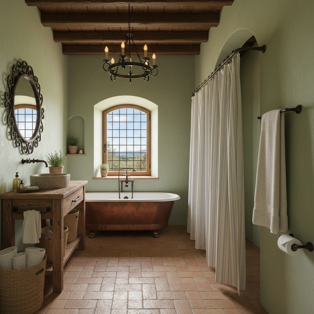 Infuse your bathroom with the sun-drenched warmth of the Mediterranean, using sage green as a soothing accent. Walls in a textured, slightly rustic sage green or stucco finish pair with terracotta floor tiles. A dark wood vanity with wrought iron hardware adds authenticity. The color palette includes sage, terracotta, warm creams, and deep blues. Materials are earthy: terracotta, dark wood, wrought iron, and textured plaster. Furniture shapes are sturdy and often hand-crafted. The mood is inviting, rich in character, and reminiscent of a sun-drenched villa.