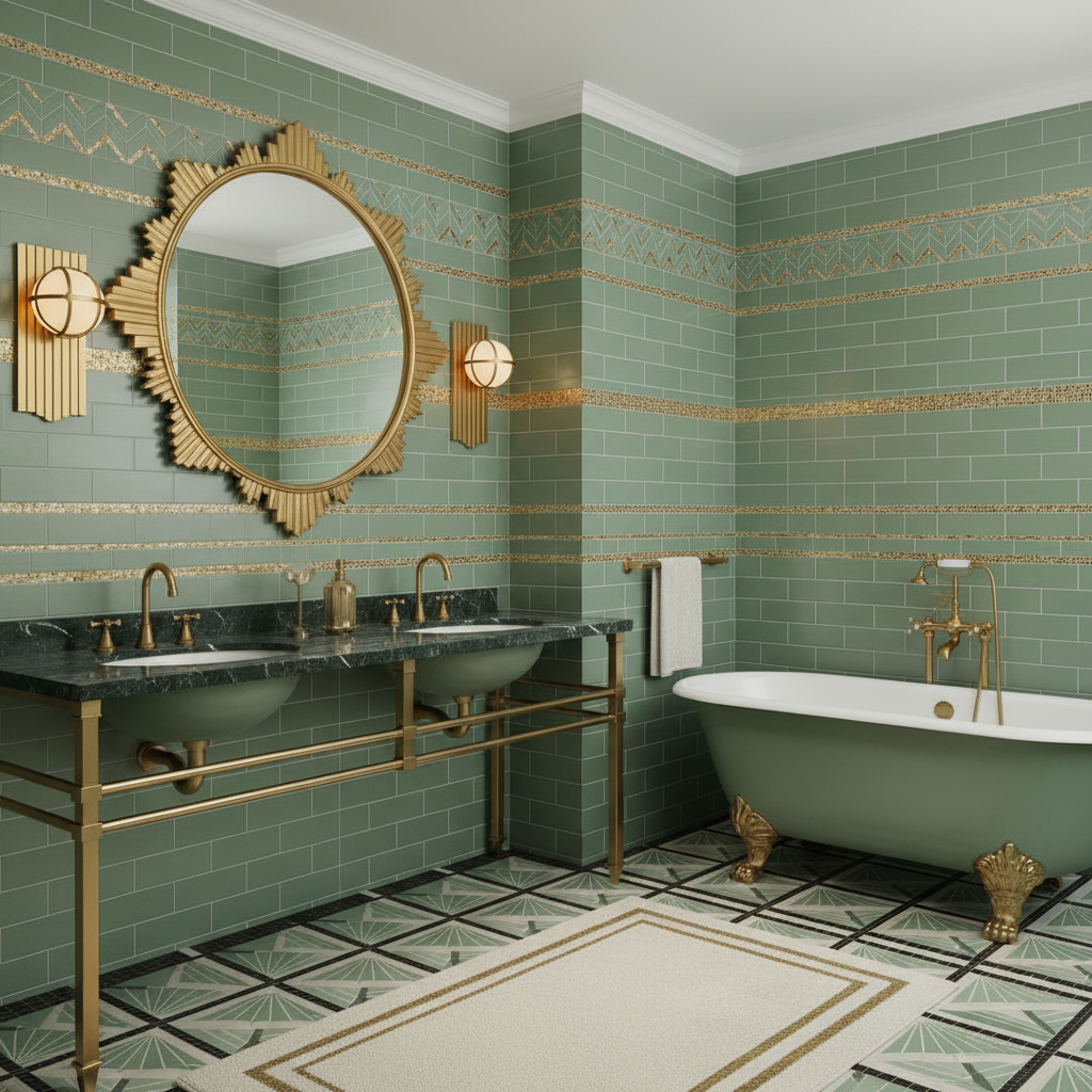 Inject a touch of vintage glamour with an Art Deco inspired sage green bathroom. A deeper, more sophisticated sage green on walls or geometric wall tiles sets the stage. Pair this with polished brass fixtures, a vanity with fluted details or a mirrored finish, and a large, ornate mirror. The color palette might include sage, black, gold, and cream. Materials are luxurious: marble countertops, brass hardware, glossy ceramic tiles, and velvet accents in a stool or curtain. Furniture silhouettes are bold and geometric, yet refined. The atmosphere is opulent, stylish, and distinctly elegant.