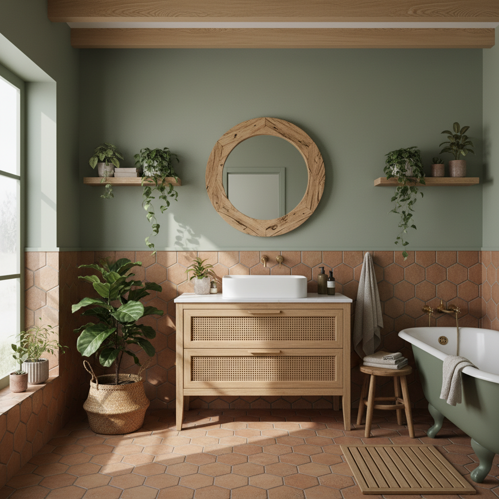 Create a grounded and organic feel by blending sage green with warm terracotta. A feature wall in a soft sage green complements terracotta floor tiles or a terracotta-tiled shower enclosure. A natural wood vanity, perhaps in a medium oak, adds warmth. The color palette is earthy and inviting: sage, terracotta, warm wood tones, and creamy whites. Materials are natural and tactile: terracotta, natural wood, textured ceramics, and woven baskets. Furniture shapes are simple and organic. The mood is comforting, natural, and wonderfully inviting, celebrating the beauty of the earth.