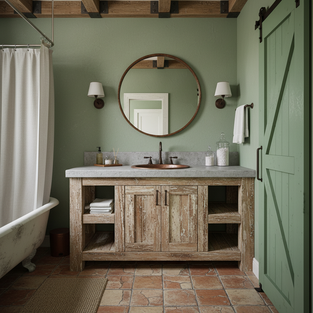 Infuse your bathroom with rustic charm using a warm sage green. Pair sage-painted shiplap walls or textured wallpaper with reclaimed wood vanities featuring rough-hewn edges. A deep, apron-front farmhouse sink in white ceramic adds to the authentic feel. Textures are key here: think woven rattan baskets for storage, soft linen towels, and perhaps a small braided rug. Fixtures in oil-rubbed bronze or matte black complement the earthy tones. The atmosphere is cozy, inviting, and reminiscent of a peaceful countryside retreat, full of character and warmth.