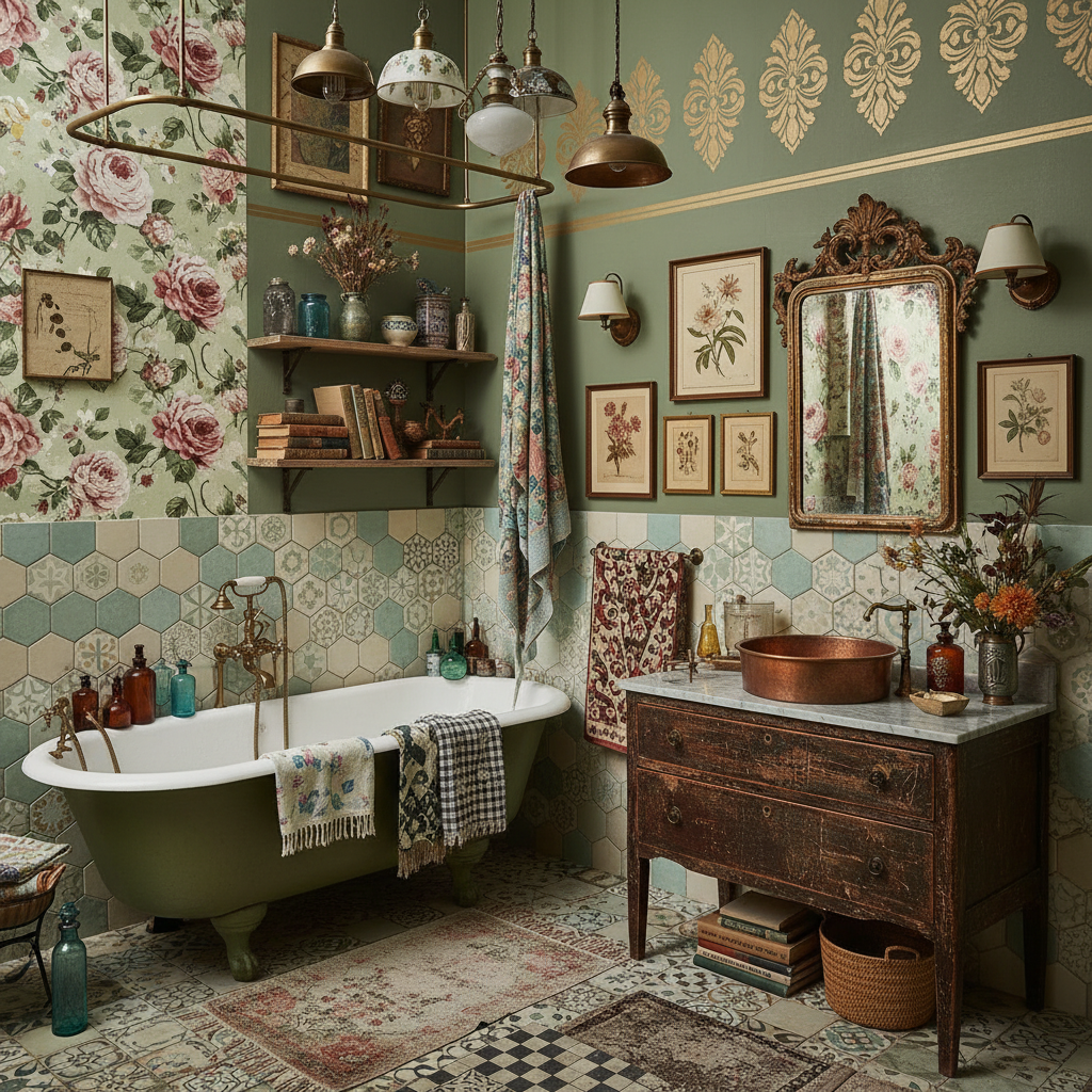 Celebrate individuality with an eclectic sage green bathroom. A feature wall in a bold sage green wallpaper with a unique pattern can anchor the space. Mix and match furniture styles—a vintage dresser repurposed as a vanity, a modern mirror, and an antique stool. The color palette is broad, incorporating sage with unexpected pops of color like coral, mustard, or deep teal. Materials are varied: patterned tiles, distressed wood, polished metals, and unique textiles. Furniture silhouettes are diverse and personal. The mood is playful, artistic, and deeply expressive.