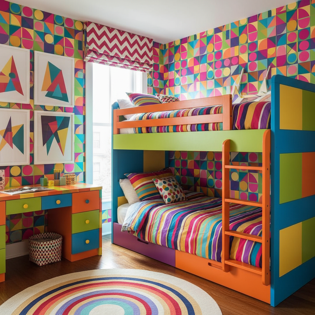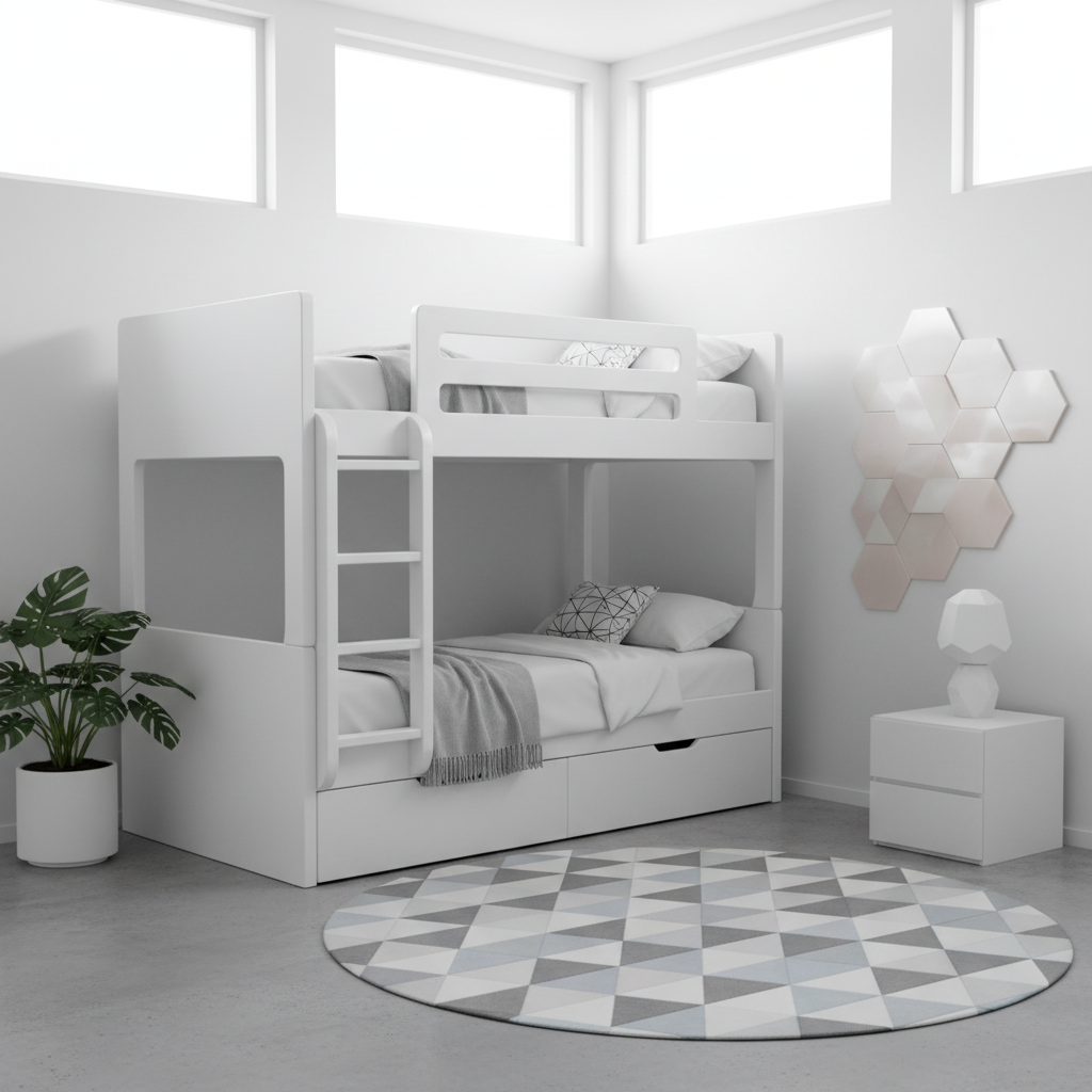 • Furniture Shapes & Silhouettes Clean-lined bunk beds, often with integrated storage that features geometric cutouts or patterns.