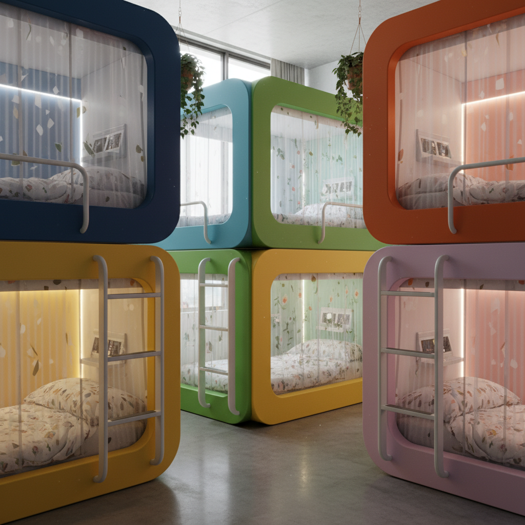 For a truly unique and modern approach, the vibrant and playful pods create distinct, semi-private spaces within the shared room. Each bunk becomes a personalized retreat with its own character.