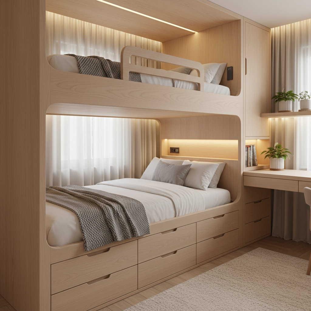 For a truly bespoke and integrated look, built-in bunk beds offer unparalleled style and functionality. They blend seamlessly with the room’s architecture, creating a custom, high-end feel.