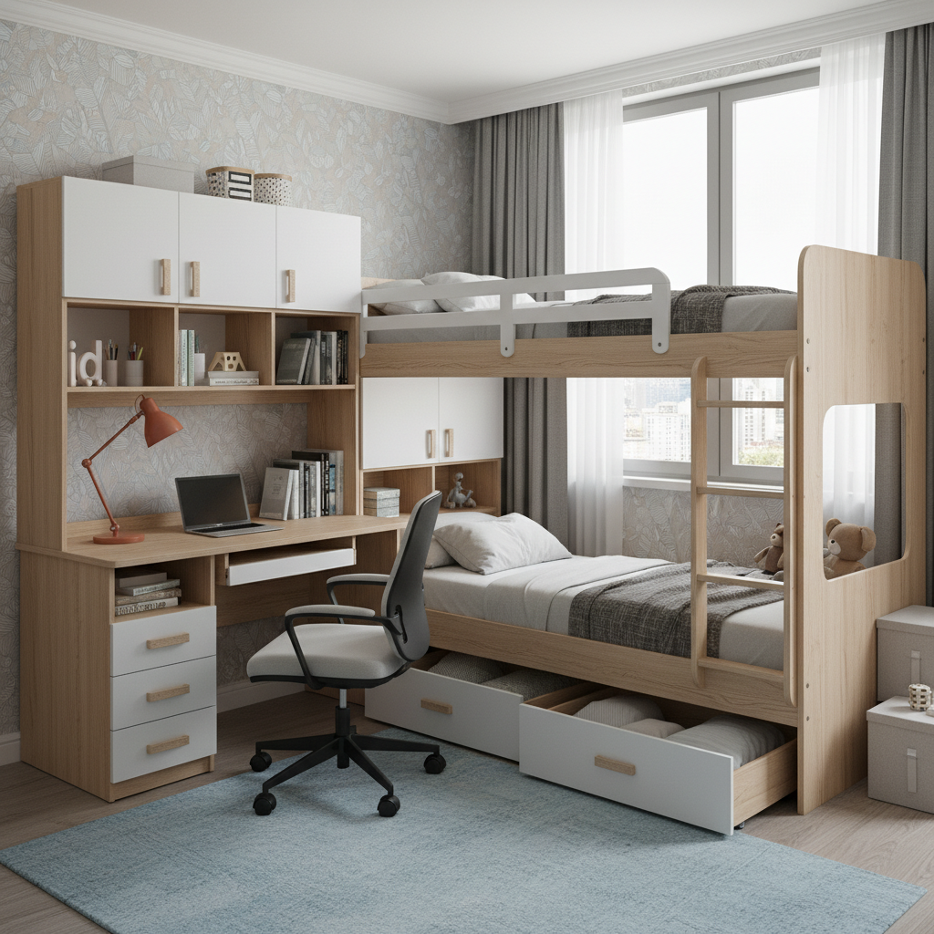 • Furniture Shapes & Silhouettes Integrated units that combine beds, desks, wardrobes, and shelving into a cohesive, space-efficient L-shape.