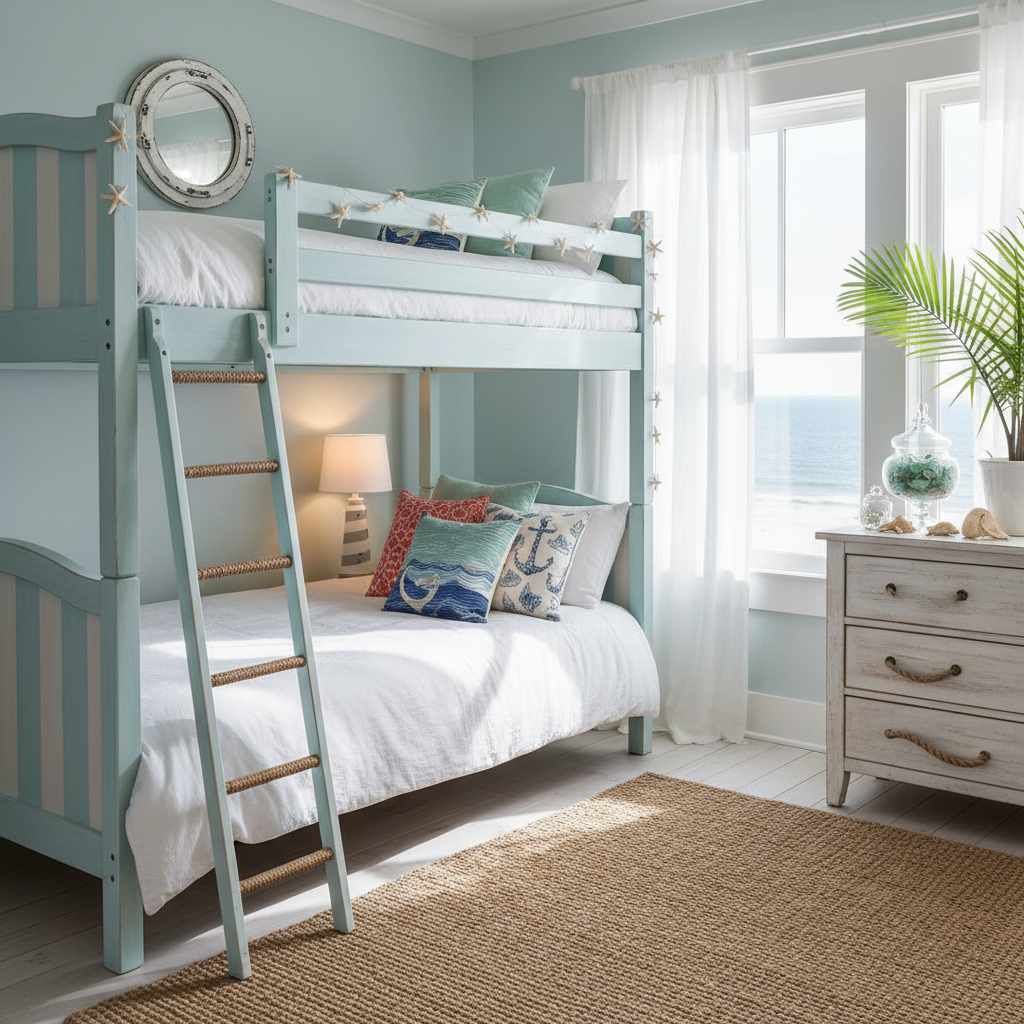 • Furniture Shapes & Silhouettes Traditional bunk bed styles, sometimes with porthole-like windows or ship’s wheel details.