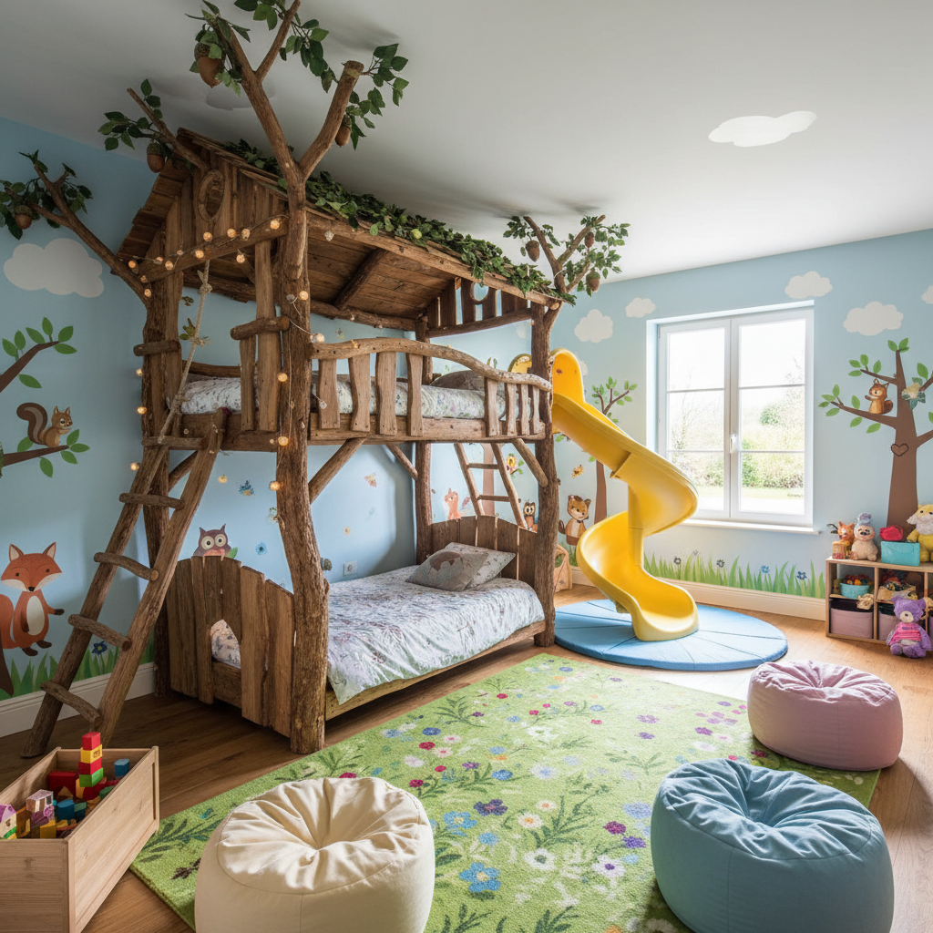 Transform the shared bedroom into an imaginative play zone with an adventurous treehouse bunk. This setup is all about fun, creativity, and making bedtime an exciting part of the day.