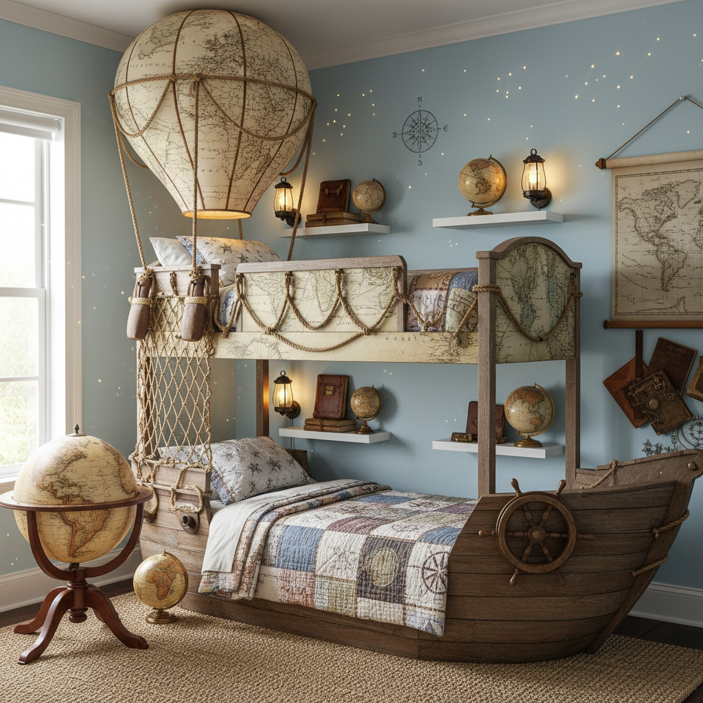 Inspire young explorers with an adventure awaits theme. This setup encourages curiosity and a love for travel, turning the bedroom into a base camp for discovery.