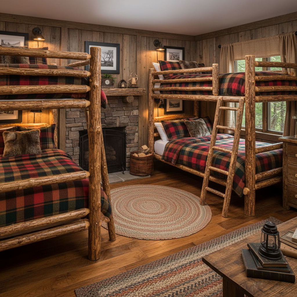 Embrace the warmth and rugged beauty of the outdoors with a rustic retreat. This theme brings the charm of a log cabin or mountain lodge into the shared bedroom.