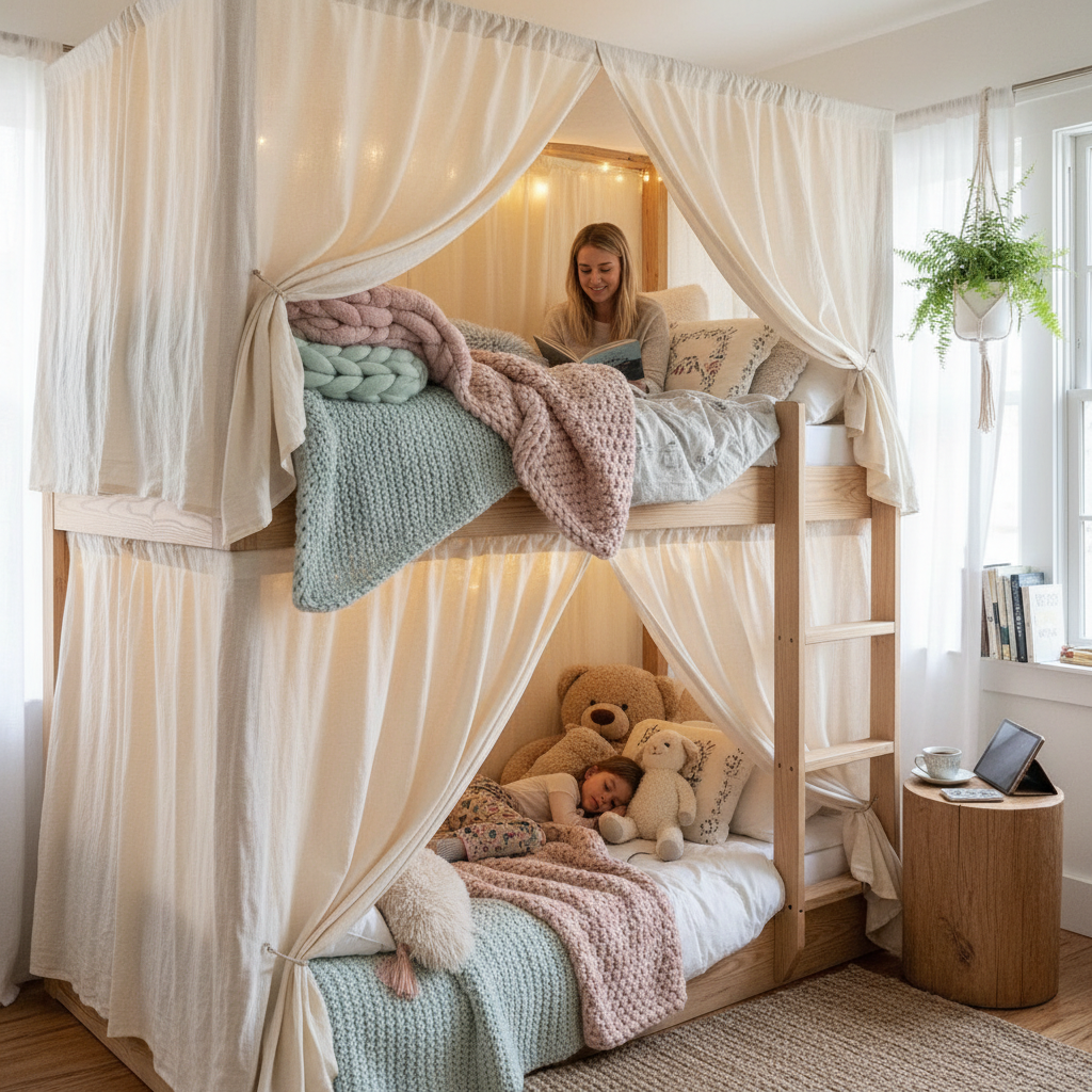 Add a touch of softness and privacy with a canopy comfort setup. This design uses draped fabrics to create individual cocoons, making each bunk feel like a special, secluded retreat.