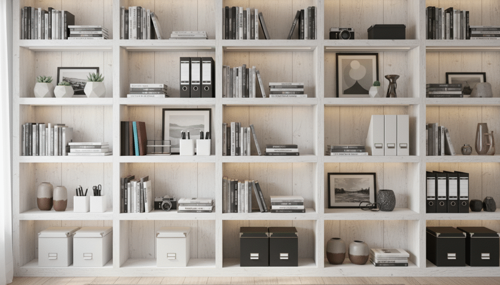 Choose shelves that match your furniture finish — natural wood for warmth, black metal for a modern touch, or white for a clean, minimalist vibe. Arrange your décor in varied heights for a balanced, visually appealing look.