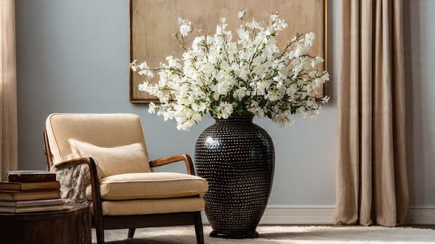 If you prefer minimal décor but want a big visual impact, a tall floor vase is your answer. Fill it with dried branches, pampas grass, or seasonal foliage.