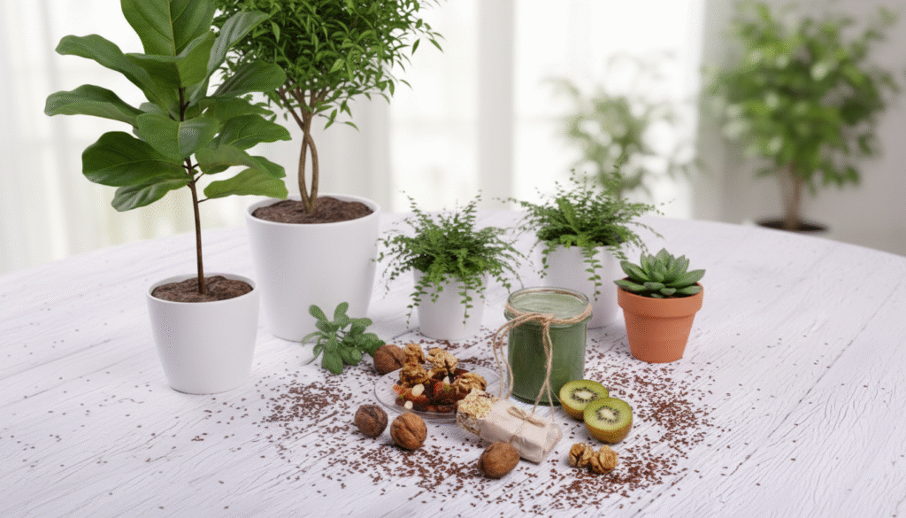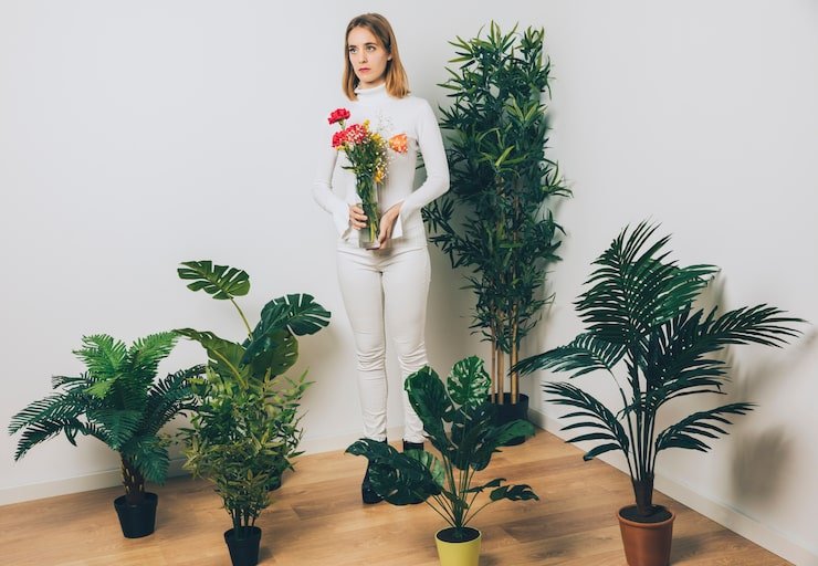 • Tall plants like fiddle-leaf figs, rubber plants, or palms.
