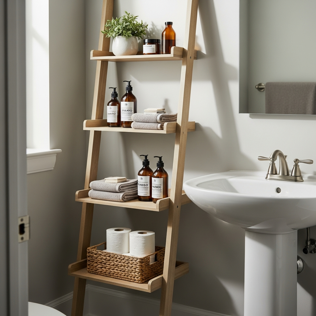 A ladder shelf is a fantastic decorative and functional piece for a small bathroom. Its leaning design provides multiple tiers for storage without feeling bulky, and its open structure keeps the visual flow light.
