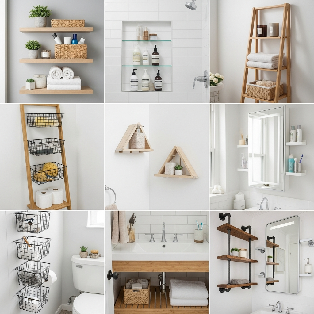 Choose slim, floating shelves in natural wood or sleek metal to display neatly folded towels, small plants, or elegant glass jars filled with cotton balls. This approach keeps the space from feeling too heavy or enclosed, adding a touch of curated style.