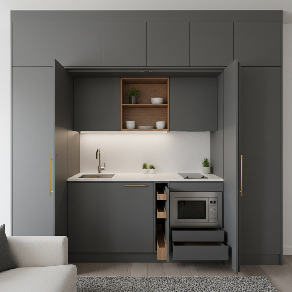 For ultimate space-saving in open-plan living, consider a kitchen that can be completely hidden behind sliding or bi-fold doors. When closed, it appears as a seamless wall of cabinetry, perfect for maintaining a minimalist aesthetic. Inside, everything is compact and efficient, from a small sink to a two-burner cooktop. A monochromatic color scheme for the exterior panels, like a deep forest green, adds sophistication. This design creates a sense of calm and order, revealing its function only when needed.
