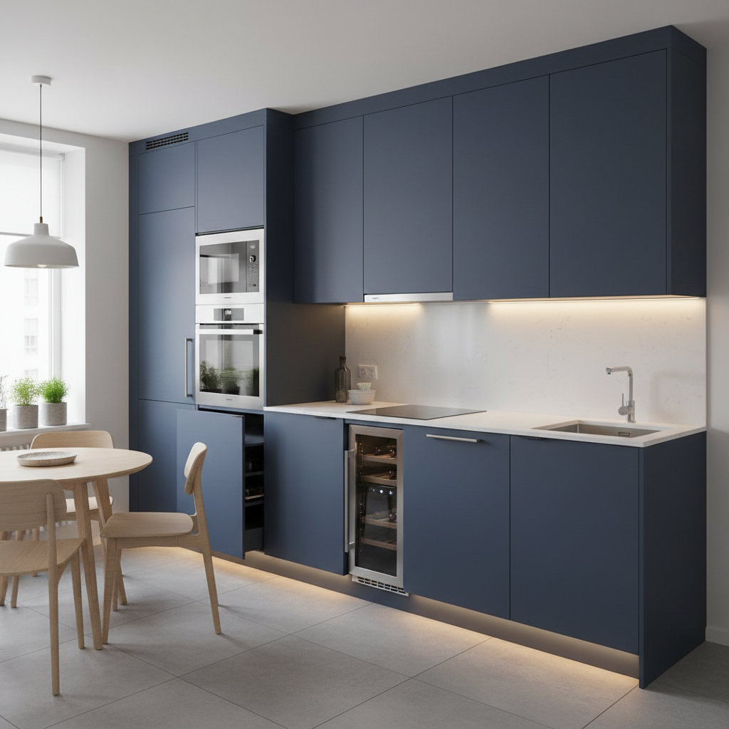 Achieve a truly spacious feel by making your appliances disappear. Fully integrated refrigerators, dishwashers, and even microwaves hidden behind cabinet panels create an unbroken, sleek aesthetic. Opt for handleless cabinetry in a matte finish, like charcoal grey or deep navy, for a sophisticated look. Simple, clean lines and a decluttered counter surface are paramount. The mood is one of serene, understated luxury, where functionality is concealed yet highly present.