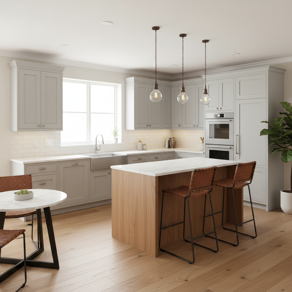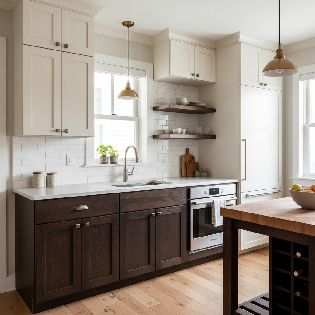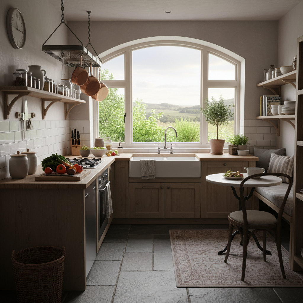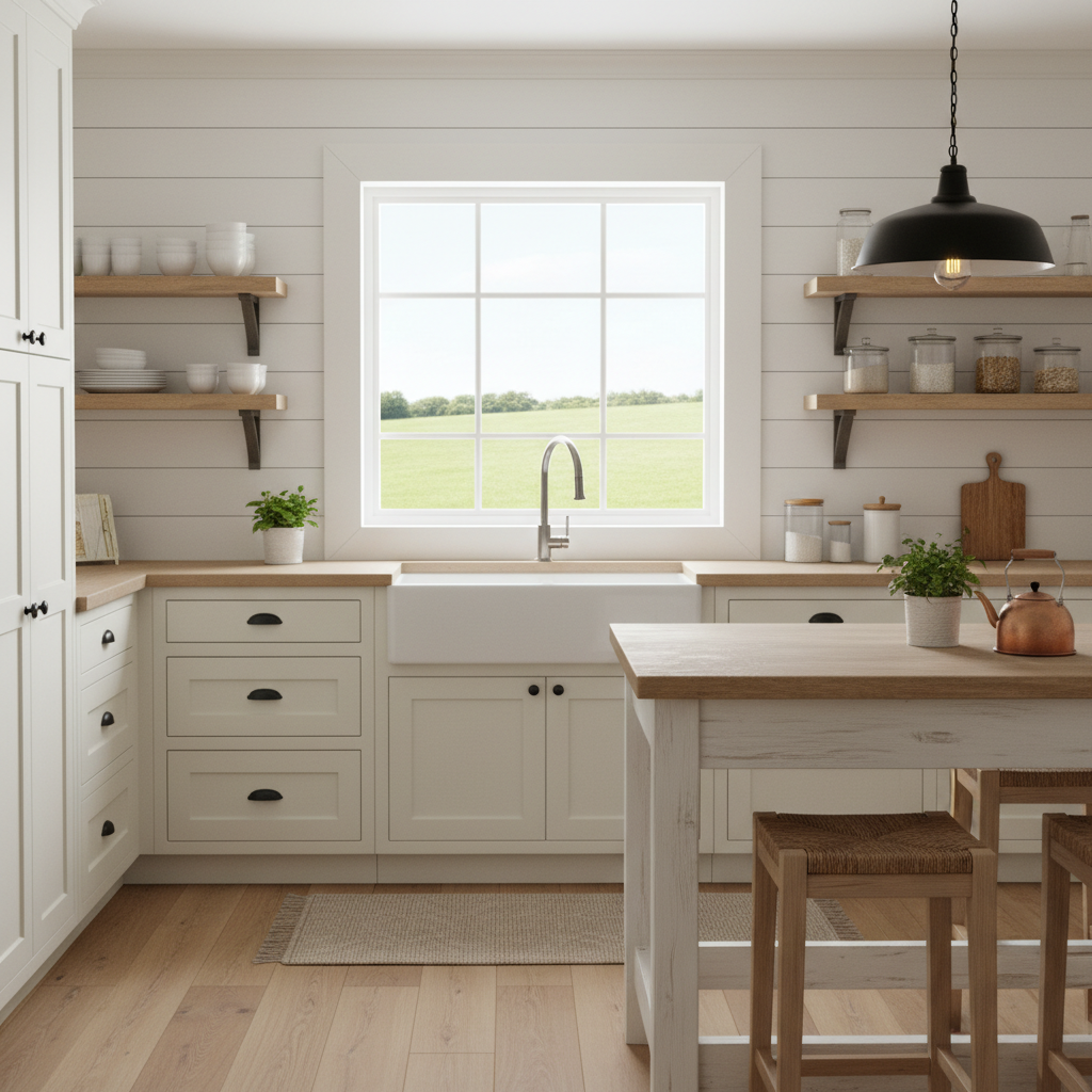 Combine rustic charm with contemporary efficiency in a small farmhouse kitchen. Shiplap walls, a deep farmhouse sink, and open shelving with simple brackets define this style. A palette of crisp whites, soft greys, and natural wood tones keeps the space feeling fresh and bright. Black matte hardware can provide a modern contrast. The mood is cozy, comfortable, and effortlessly stylish, celebrating simple, honest design.