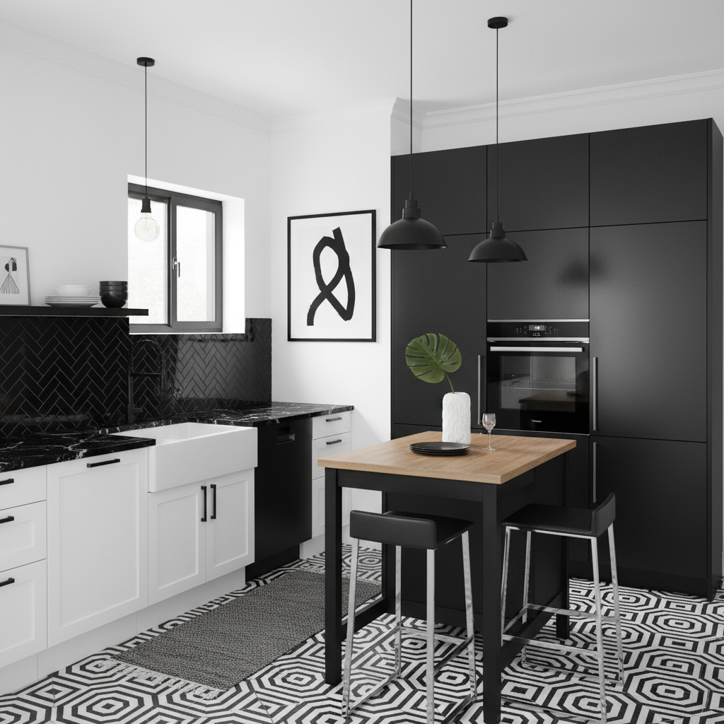 A monochrome palette of black and white is a timeless choice that can make a small kitchen feel incredibly chic and sophisticated. Use white for the majority of surfaces (walls, upper cabinets) and black for contrasting elements like lower cabinets, countertops, or hardware. This high contrast creates visual interest and definition. The clean lines and sharp contrasts contribute to an elegant, modern mood.