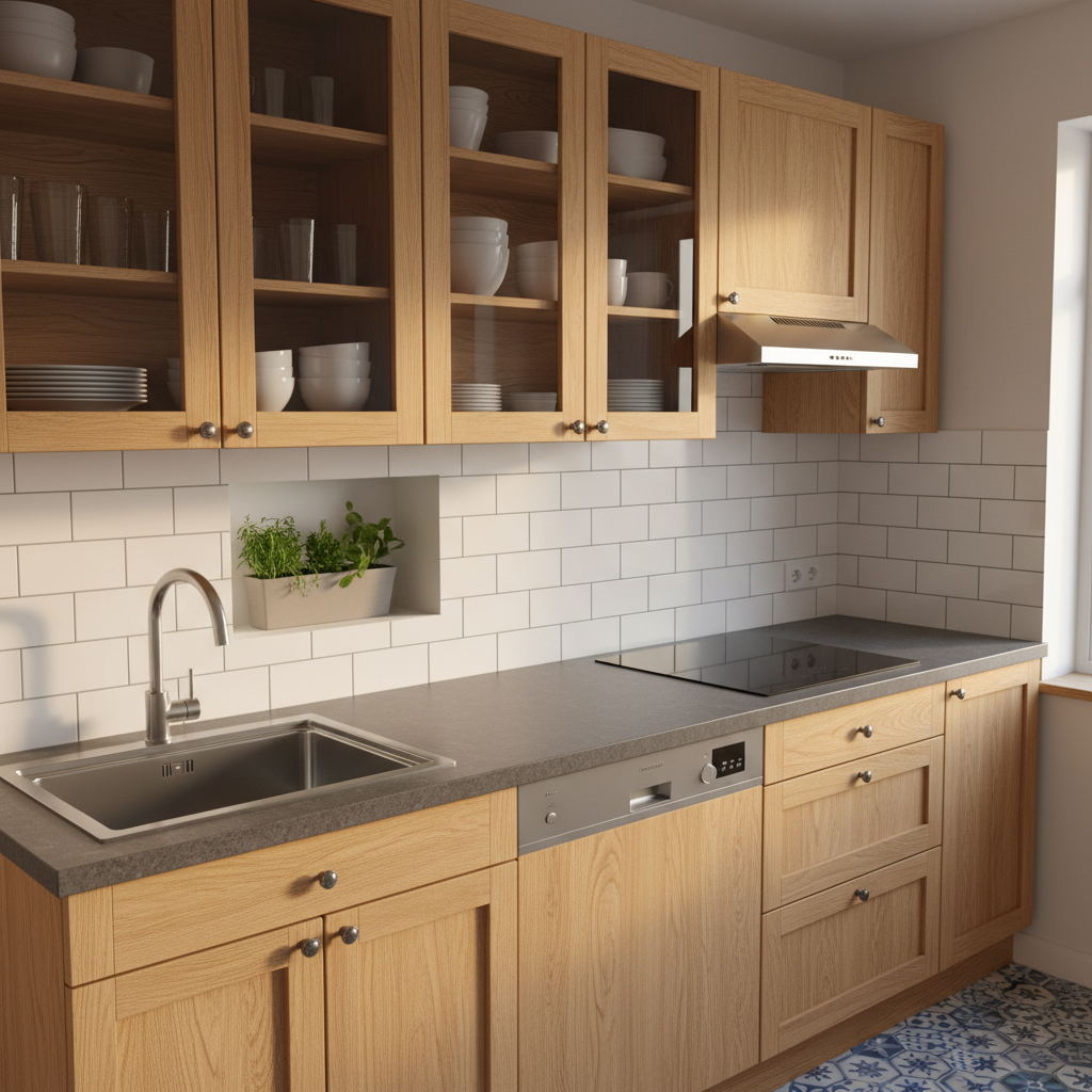 Often overlooked, a corner sink can be a brilliant space-saving solution in a small L-shaped or U-shaped kitchen. It frees up valuable counter space along the main runs of cabinetry. While it requires careful planning, modern corner sinks are ergonomically designed and can be quite stylish. Pair with light, reflective tiles for the backsplash to enhance brightness around the corner. This layout is about clever utilization of often-wasted space.
