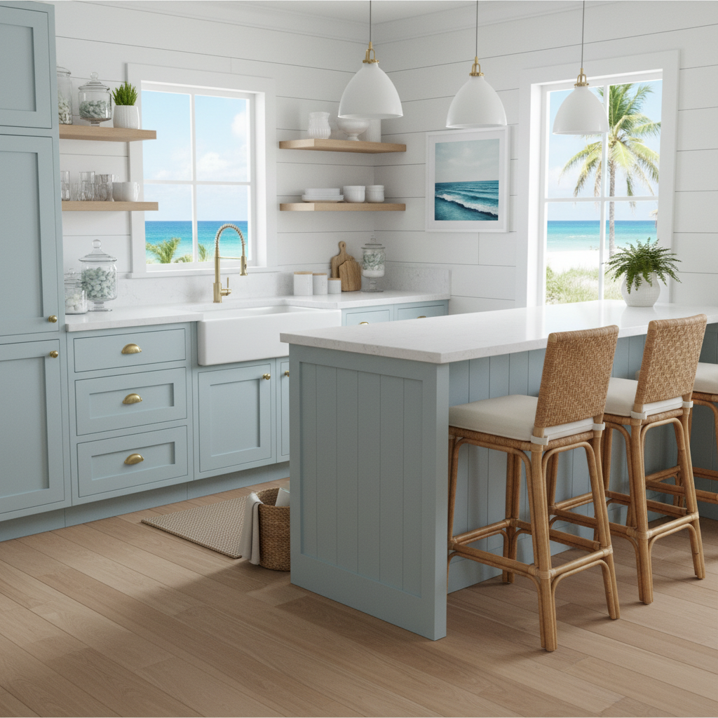 Bring the calming essence of the seaside into your small kitchen with a coastal-inspired design. Think soft blues, sandy neutrals, and crisp whites. Beadboard paneling, rattan accents, and light-stained wood countertops evoke a beachy feel. Keep decor minimal, focusing on natural textures like woven baskets. The atmosphere is light, airy, and tranquil, perfect for a refreshing culinary space.