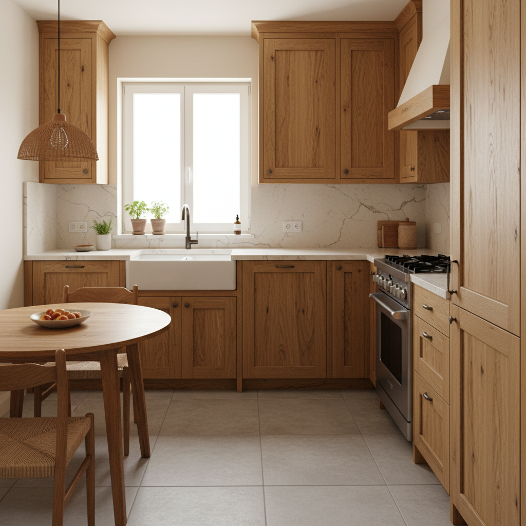 Create a harmonious and grounded small kitchen by combining natural wood cabinetry with light stone countertops, such as marble or granite. The organic textures and earthy tones bring warmth and a sense of calm. Keep the overall design simple, letting the materials speak for themselves. This approach results in a kitchen that feels inviting, authentic, and naturally luxurious.