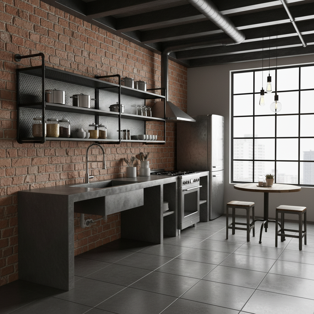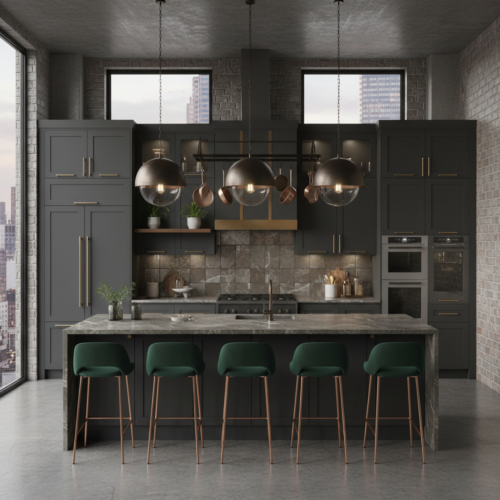 Embrace the drama of dark tones in a small urban loft kitchen. Deep charcoal grey or even black cabinetry can create a sense of depth and sophistication. Balance this with metallic accents like copper pendant lights or stainless steel appliances to reflect light. Concrete countertops and exposed piping can enhance the industrial edge. The mood is chic, moody, and distinctly modern, perfect for a city dwelling.