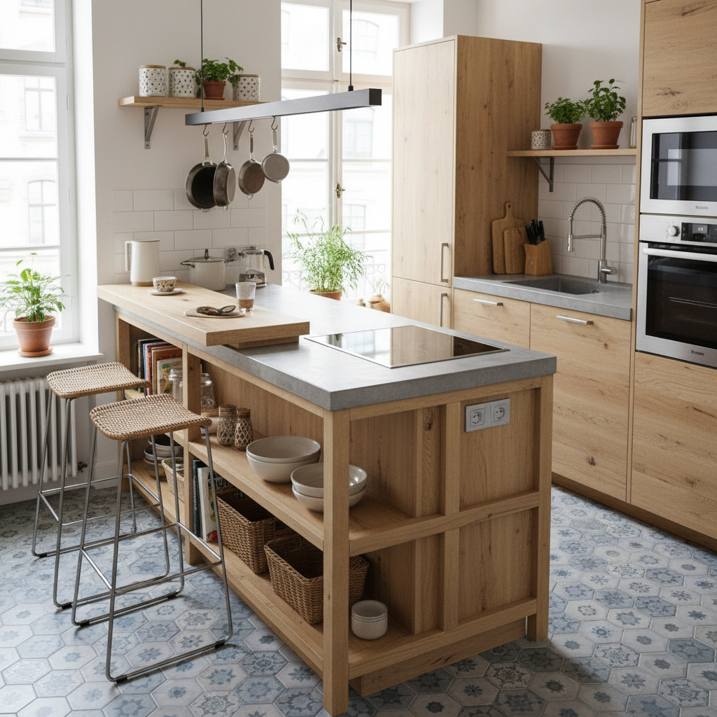Even a small kitchen can accommodate a highly functional island if designed correctly. Opt for a slim, compact island that incorporates multiple functions: a small prep area, open shelving or closed cabinets for storage, and an overhang for casual seating. Choose a contrasting material for the island top, like butcher block against a painted base, to make it a focal point. This layout transforms a small space into a bustling hub of activity.