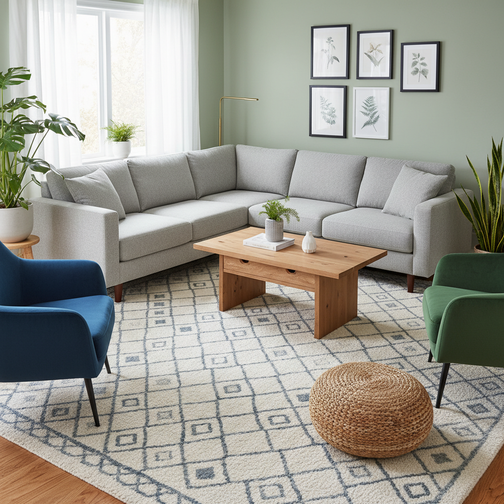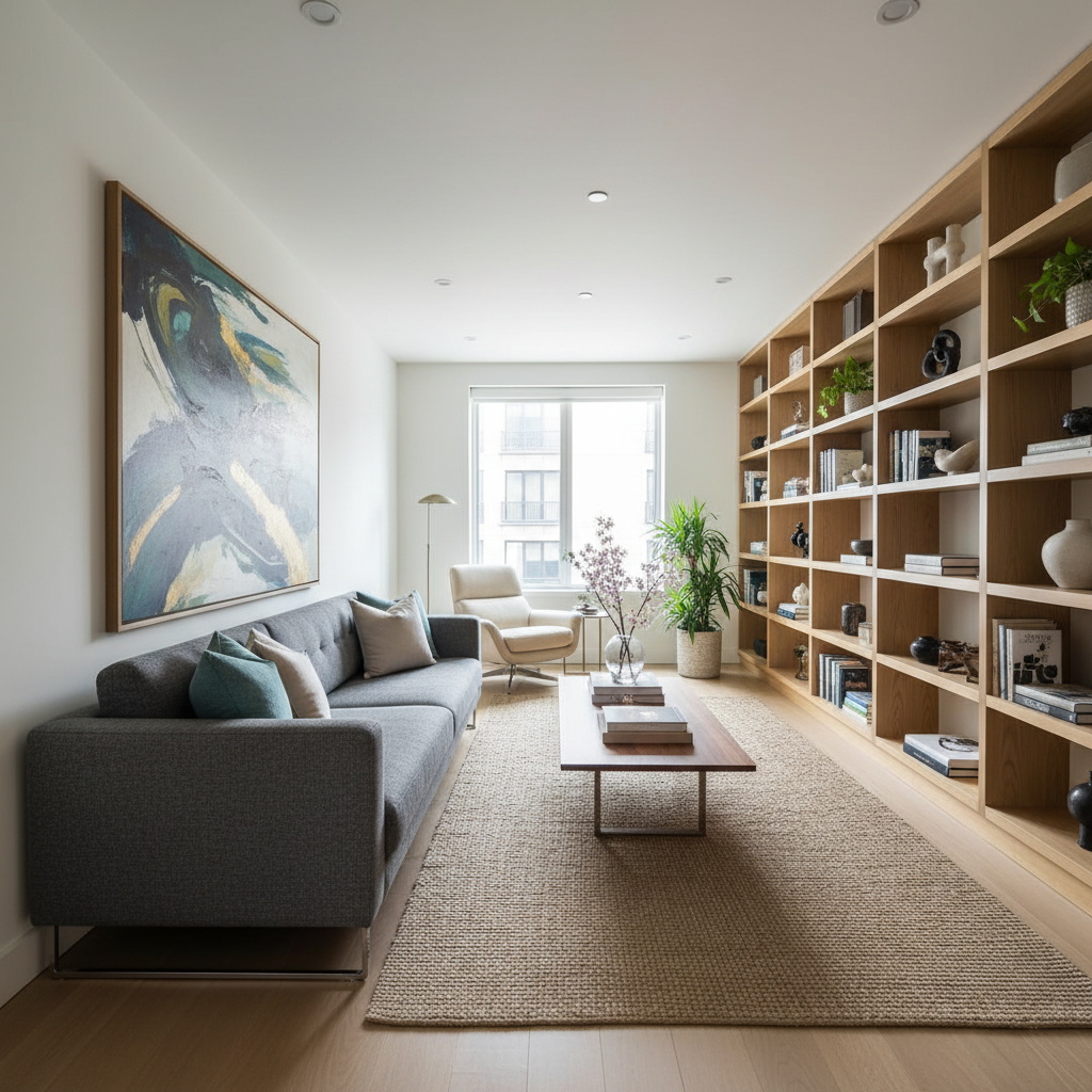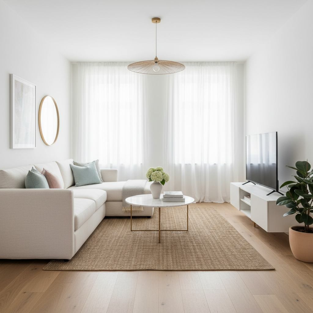 Embrace the clean, functional, and cozy aesthetic of Scandinavian design. Opt for light wood furniture with simple, elegant lines. A compact sofa in a light grey or cream fabric, paired with a sheepskin throw and minimalist art, creates a serene space. The palette is typically muted—whites, greys, pale blues, and natural wood. The atmosphere is calm, welcoming, and uncluttered.