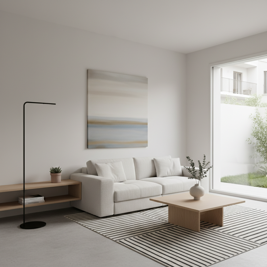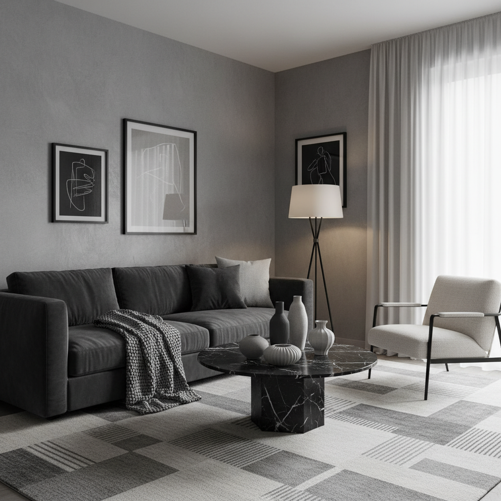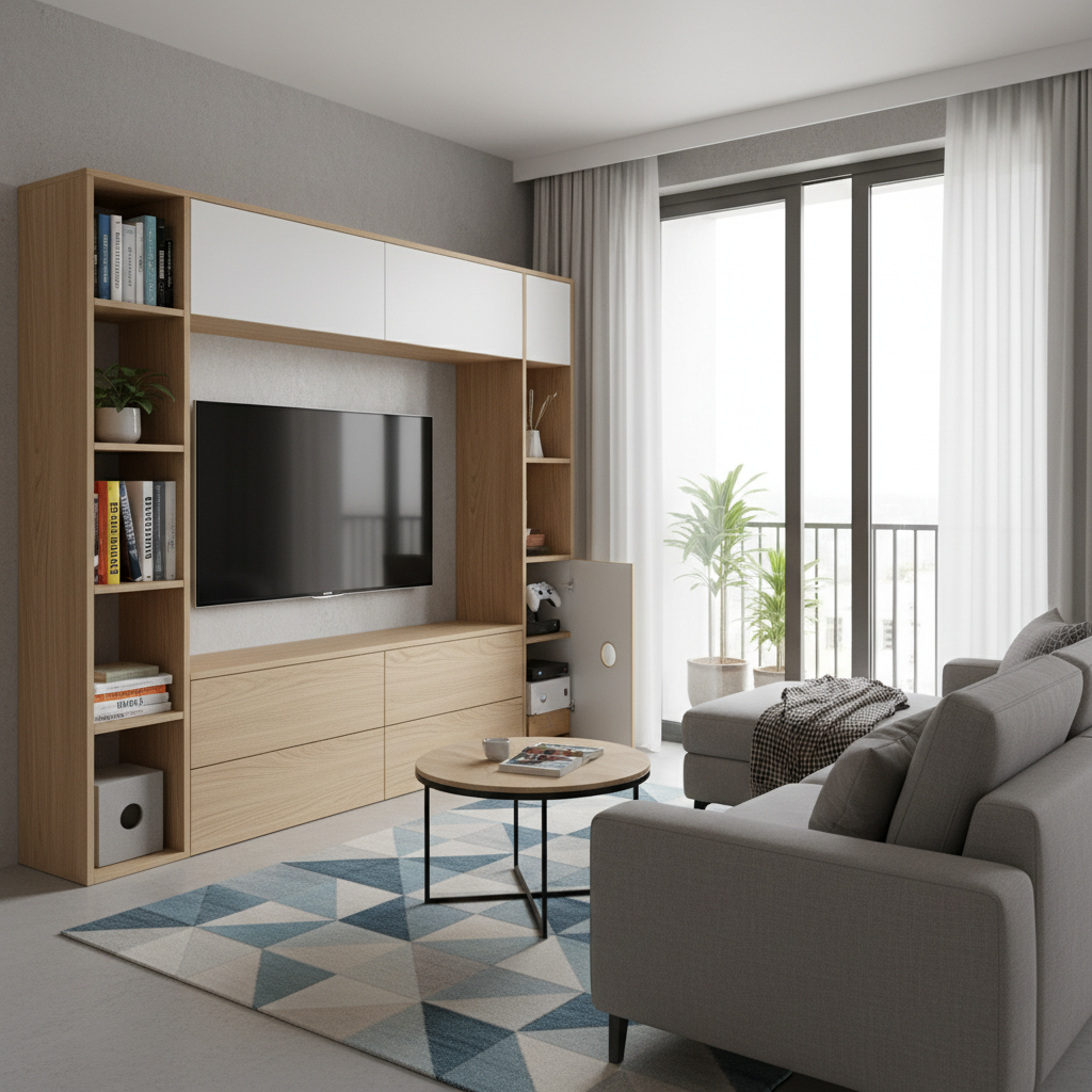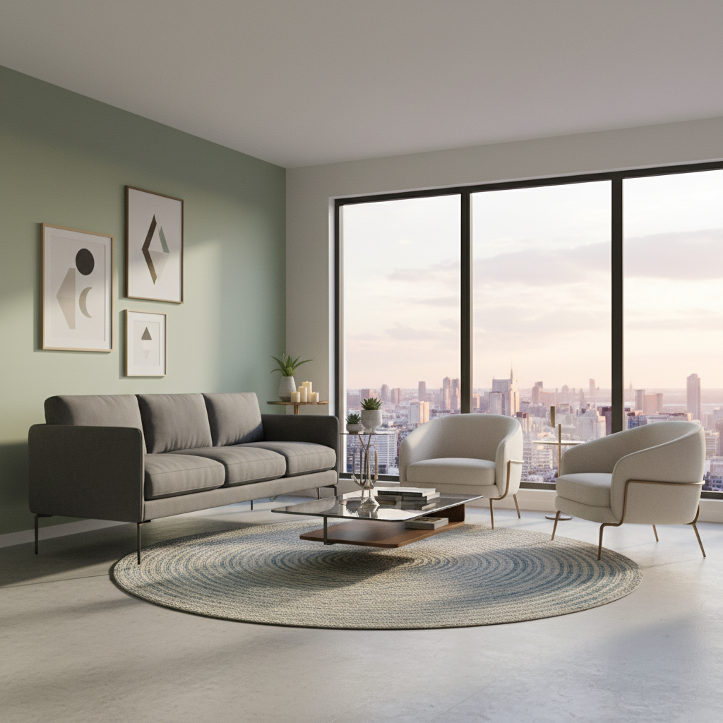 Embrace the clean, functional, and cozy aesthetic of Scandinavian design. Opt for light wood furniture with simple, elegant lines. A compact sofa in a light grey or cream fabric, paired with a sheepskin throw and minimalist art, creates a serene space. The palette is typically muted—whites, greys, pale blues, and natural wood. The atmosphere is calm, welcoming, and uncluttered.