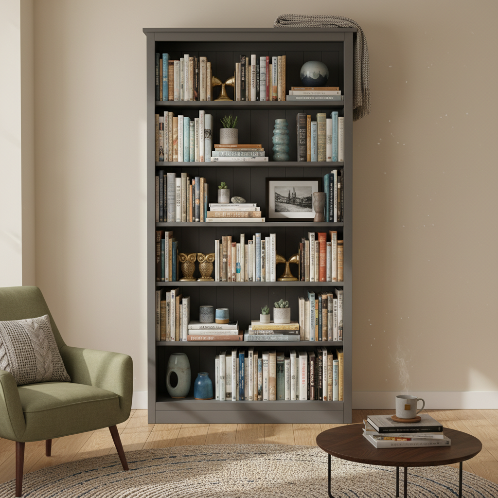 Draw the eye upwards with tall, slim bookcases or shelving units. This utilizes vertical space without taking up much floor area. Organize books and decor by color for a visually pleasing effect. A dark wood bookcase against a lighter wall provides contrast and depth. The mood here is intellectually stimulating and cozy, perfect for book lovers.