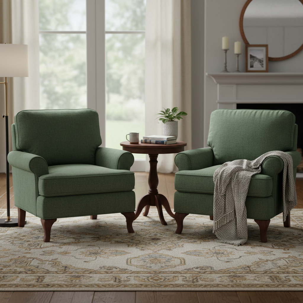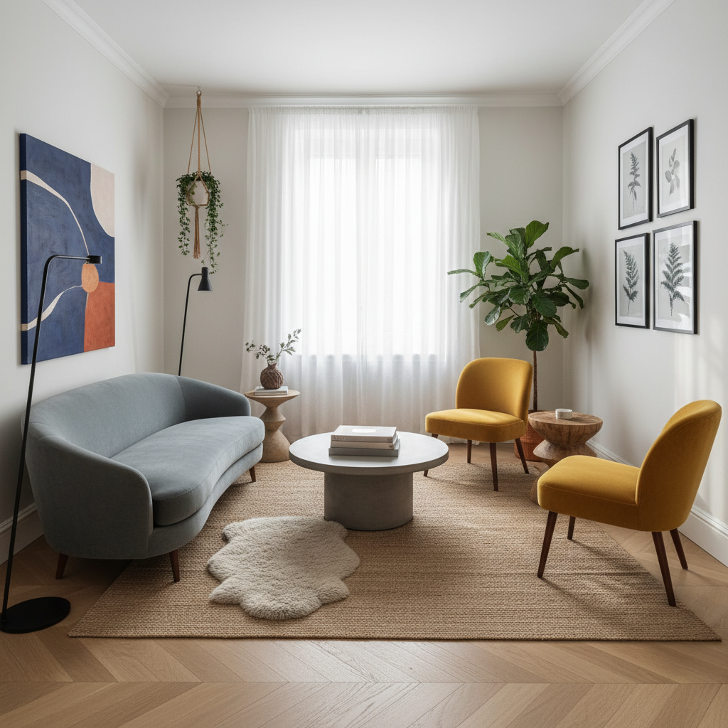 Sometimes, a sofa is just too big. Two comfortable armchairs, perhaps in a striking mustard yellow or deep teal, can provide ample seating. Position them side-by-side with a shared side table or facing each other. Choose chairs with slender arms and legs. Add a plush rug and warm lighting to create a snug, personal retreat. The mood is intimate and stylishly understated.