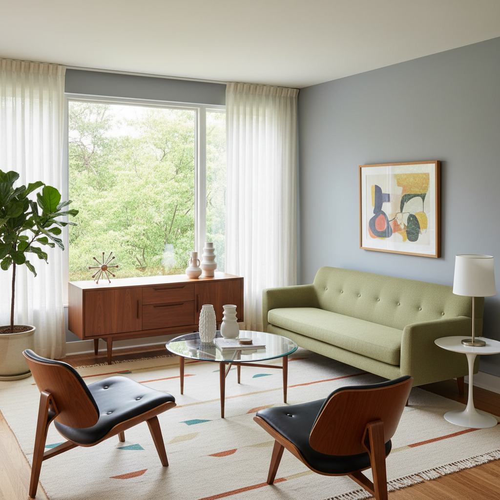 Mid-Century Modern furniture often features sleek lines, tapered legs, and compact forms, making it ideal for small spaces. A small sofa or a pair of armchairs in a vibrant color like burnt orange or olive green, combined with a walnut coffee table, sets the scene. The mood is sophisticated, retro-chic, and timelessly stylish, celebrating iconic design.