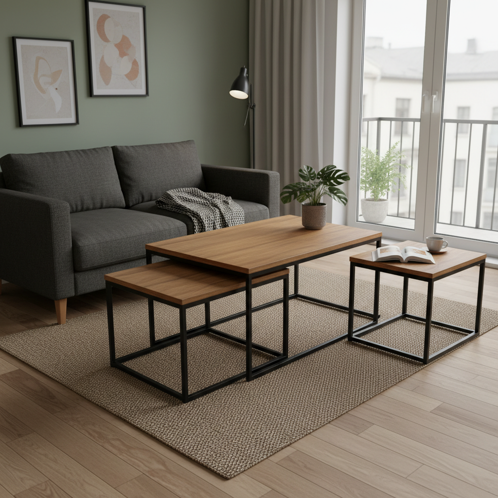 Nesting tables are the ultimate space-saving solution for coffee tables. They can be pulled apart for multiple surfaces when needed and tucked away neatly when not. Look for a set in mixed materials, such as a metal frame with a marble top, or all wood. Their lightweight design keeps the room feeling open. A minimalist aesthetic with a touch of industrial chic defines this layout.