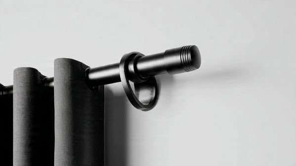 Hardware matters in small spaces — sleek black rods add modern elegance.